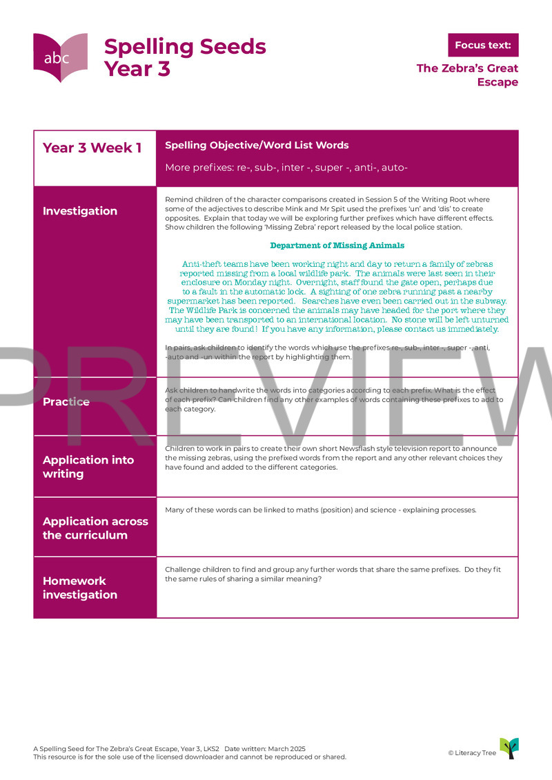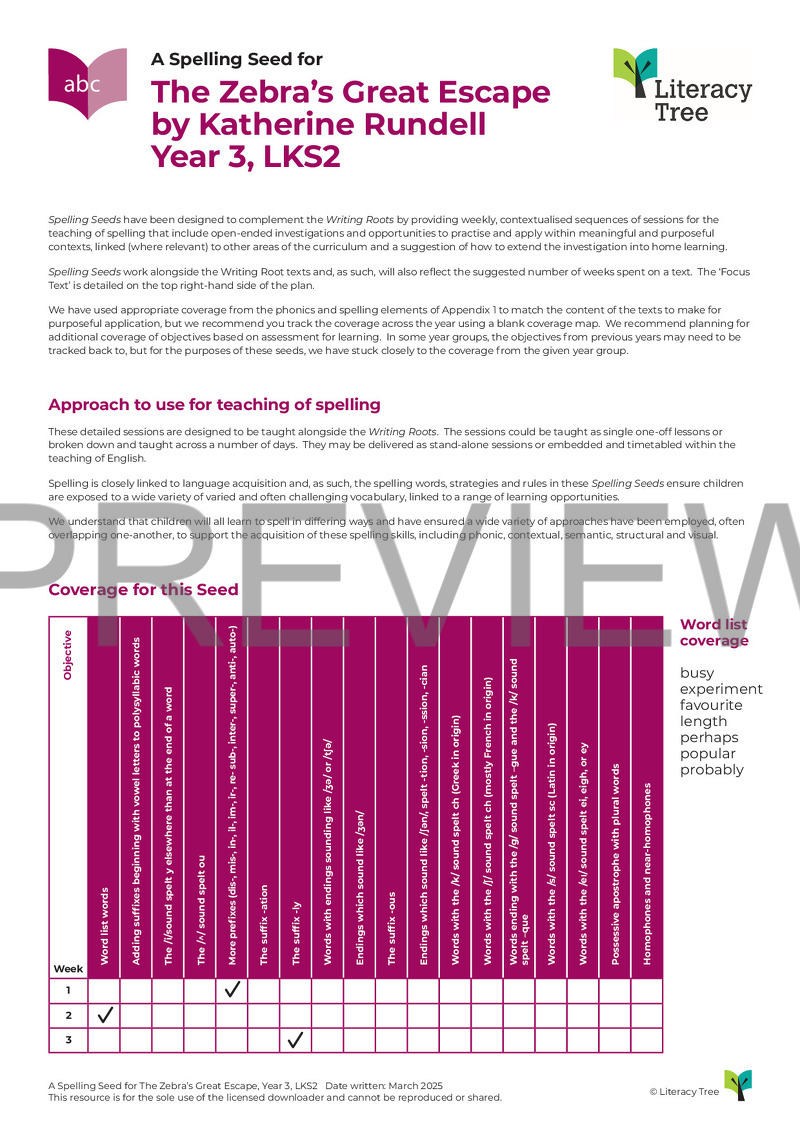 This is a three-session spelling seed for the book The Zebra's Great Escape by Katherine Rundell. Below is the coverage from Appendix 1 of the National Curriculum 2014.