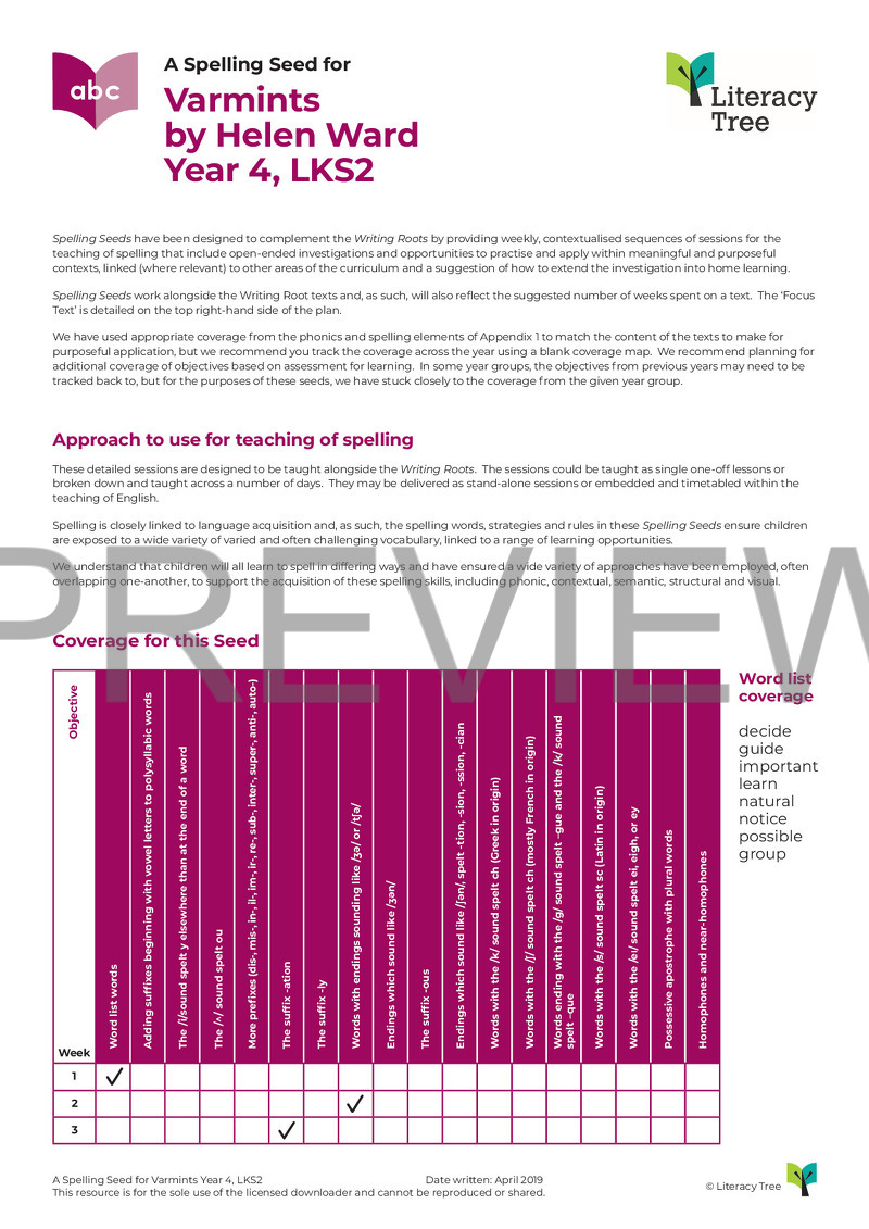 This is a three-session spelling seed for the book Varmints by Helen Ward. Below is the coverage from Appendix 1 of the National Curriculum 2014.
