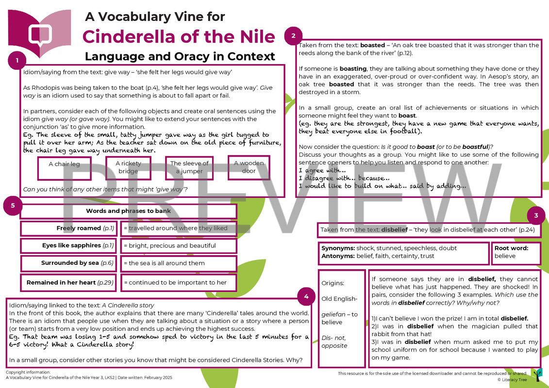 A Vocabulary Vine is designed to be a sister resource to a Writing Root and Spelling Seed. It sits within our wider Teach Through a Text approach by explicitly identifying vocabulary from the book and providing additional opportunities for paired, small group and whole class experimentation with this vocabulary in context. Vocabulary Vines further complement spelling development too through exploration of the morphology (word structure) and etymology (origins) of words. They also provide oracy opportunities through a focus on talk tasks and on oral sentence construction. They are designed for short burst oral and vocabulary development.
