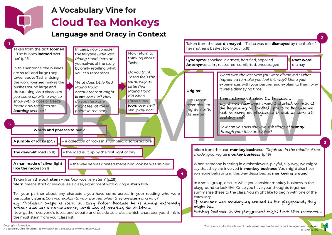 A Vocabulary Vine is designed to be a sister resource to a Writing Root and Spelling Seed. It sits within our wider Teach Through a Text approach by explicitly identifying vocabulary from the book and providing additional opportunities for paired, small group and whole class experimentation with this vocabulary in context. Vocabulary Vines further complement spelling development too through exploration of the morphology (word structure) and etymology (origins) of words. They also provide oracy opportunities through a focus on talk tasks and on oral sentence construction. They are designed for short burst oral and vocabulary development.