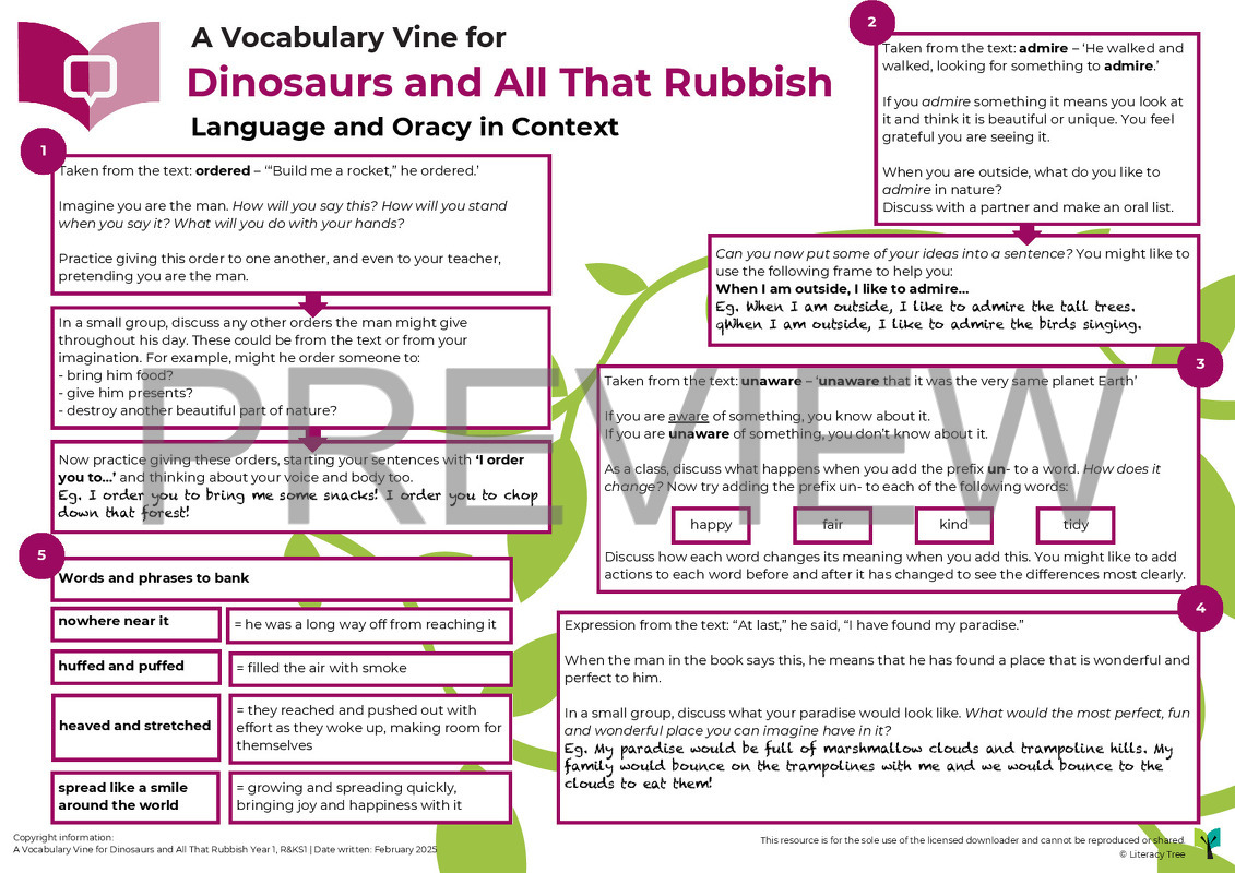 A Vocabulary Vine is designed to be a sister resource to a Writing Root and Spelling Seed. It sits within our wider Teach Through a Text approach by explicitly identifying vocabulary from the book and providing additional opportunities for paired, small group and whole class experimentation with this vocabulary in context. Vocabulary Vines further complement spelling development too through exploration of the morphology (word structure) and etymology (origins) of words. They also provide oracy opportunities through a focus on talk tasks and on oral sentence construction. They are designed for short burst oral and vocabulary development.