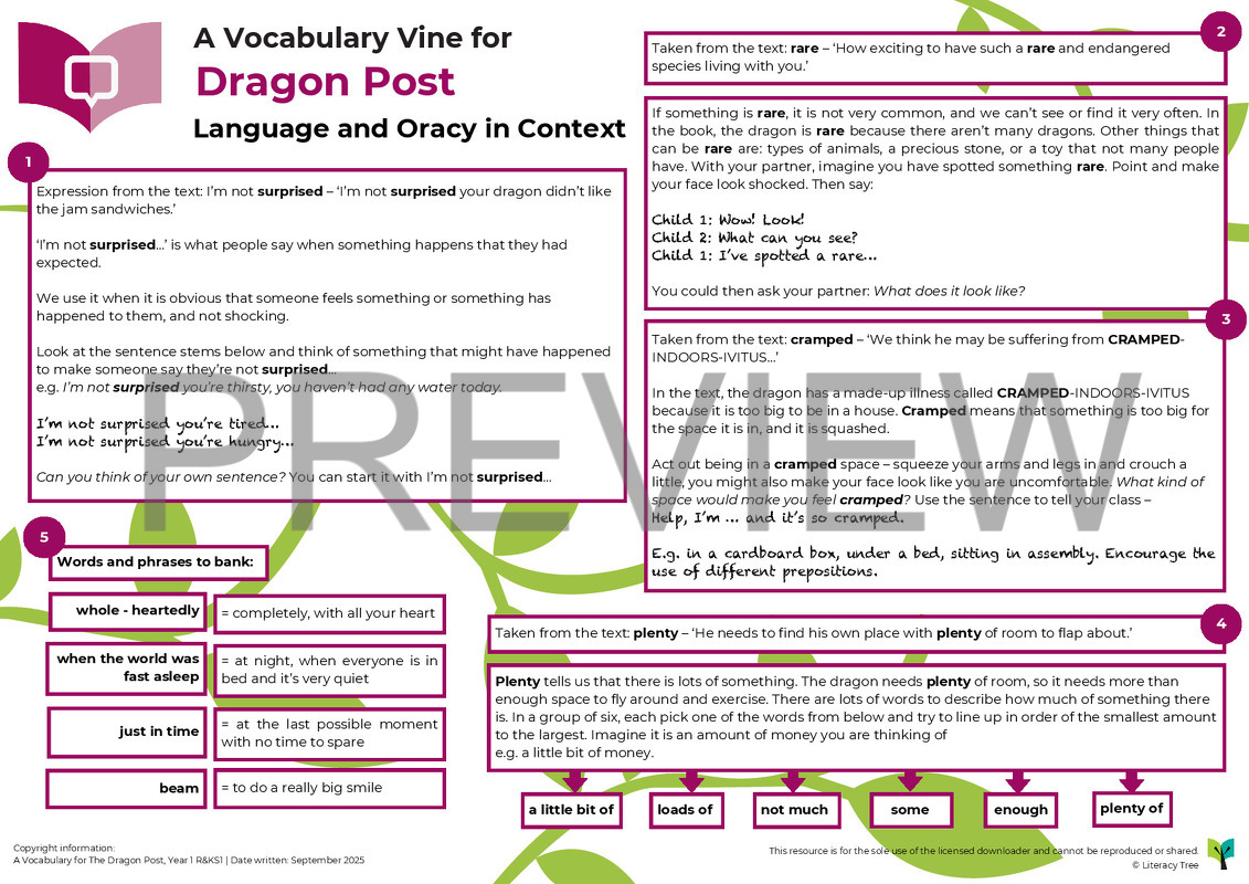 A Vocabulary Vine is designed to be a sister resource to a Writing Root and Spelling Seed. It sits within our wider Teach Through a Text approach by explicitly identifying vocabulary from the book and providing additional opportunities for paired, small group and whole class experimentation with this vocabulary in context. Vocabulary Vines further complement spelling development too through exploration of the morphology (word structure) and etymology (origins) of words. They also provide oracy opportunities through a focus on talk tasks and on oral sentence construction. They are designed for short burst oral and vocabulary development