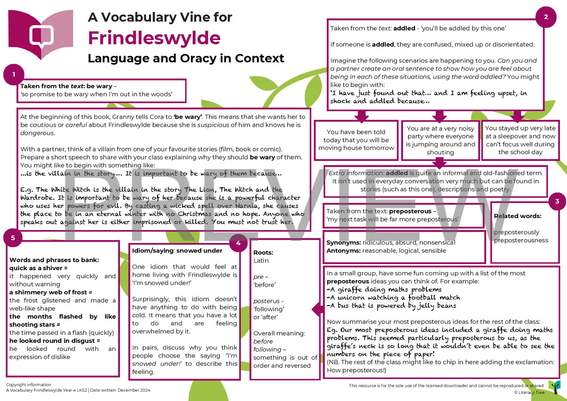 A Vocabulary Vine is designed to be a sister resource to a Writing Root and Spelling Seed. It sits within our wider Teach Through a Text approach by explicitly identifying vocabulary from the book and providing additional opportunities for paired, small group and whole class experimentation with this vocabulary in context. Vocabulary Vines further complement spelling development too through exploration of the morphology (word structure) and etymology (origins) of words. They also provide oracy opportunities through a focus on talk tasks and on oral sentence construction. They are designed for short burst oral and vocabulary development.