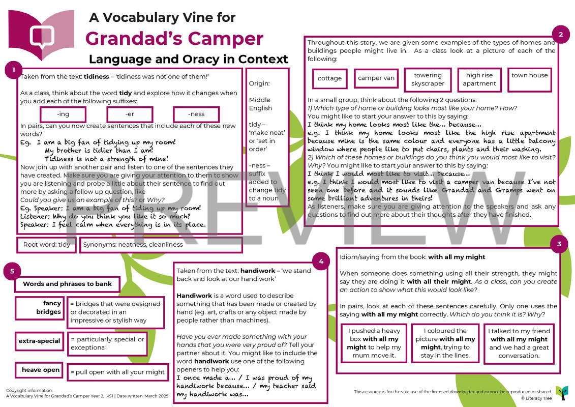 A Vocabulary Vine is designed to be a sister resource to a Writing Root and Spelling Seed. It sits within our wider Teach Through a Text approach by explicitly identifying vocabulary from the book and providing additional opportunities for paired, small group and whole class experimentation with this vocabulary in context. Vocabulary Vines further complement spelling development too through exploration of the morphology (word structure) and etymology (origins) of words. They also provide oracy opportunities through a focus on talk tasks and on oral sentence construction. They are designed for short burst oral and vocabulary development.