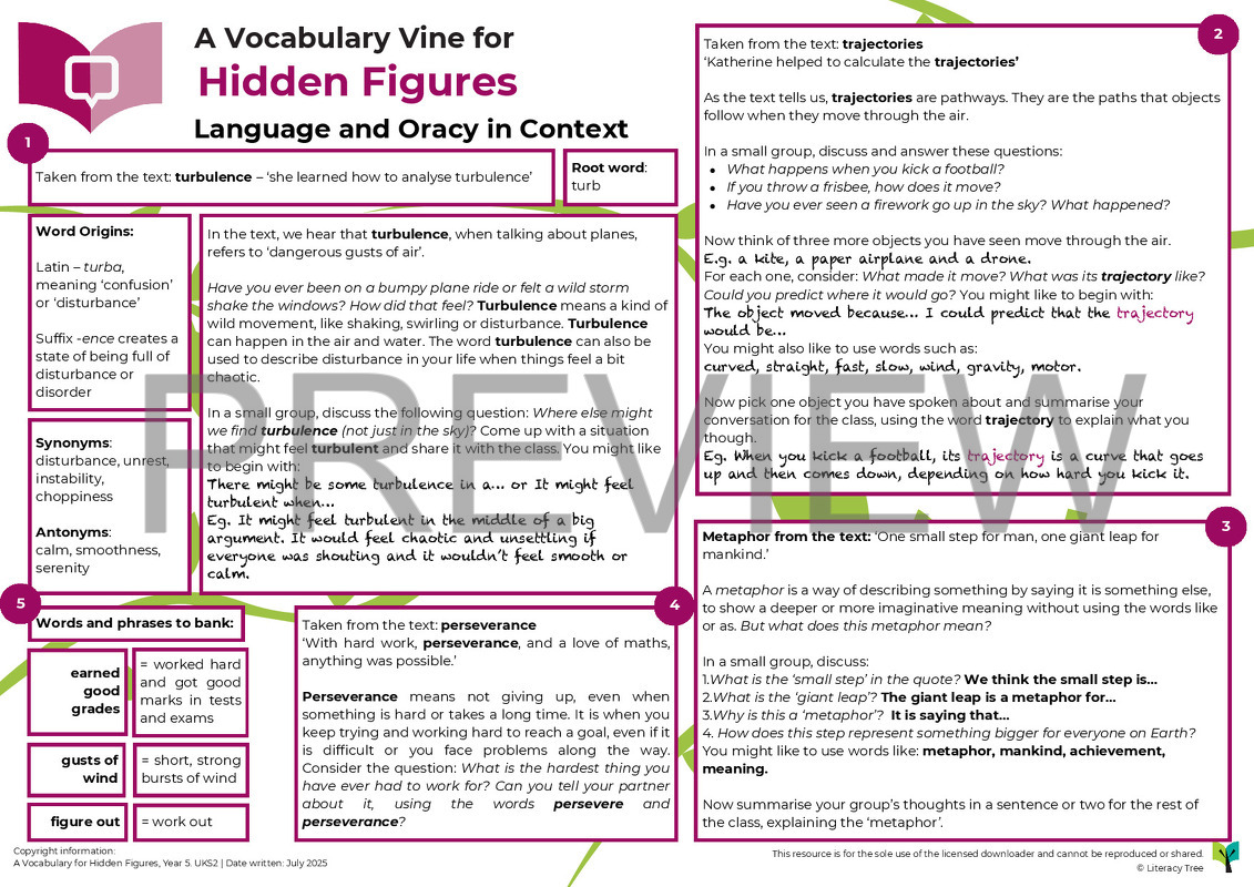A Vocabulary Vine is designed to be a sister resource to a Writing Root and Spelling Seed. It sits within our wider Teach Through a Text approach by explicitly identifying vocabulary from the book and providing additional opportunities for paired, small group and whole class experimentation with this vocabulary in context. Vocabulary Vines further complement spelling development too through exploration of the morphology (word structure) and etymology (origins) of words. They also provide oracy opportunities through a focus on talk tasks and on oral sentence construction. They are designed for short burst oral and vocabulary development.