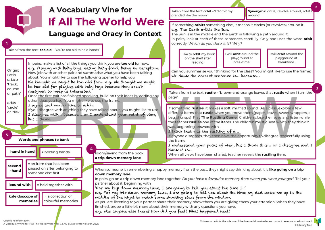 A Vocabulary Vine is designed to be a sister resource to a Writing Root and Spelling Seed. It sits within our wider Teach Through a Text approach by explicitly identifying vocabulary from the book and providing additional opportunities for paired, small group and whole class experimentation with this vocabulary in context. Vocabulary Vines further complement spelling development too through exploration of the morphology (word structure) and etymology (origins) of words. They also provide oracy opportunities through a focus on talk tasks and on oral sentence construction. They are designed for short burst oral and vocabulary development.