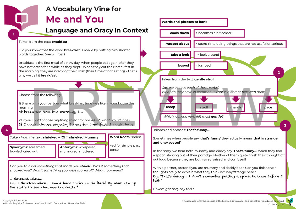 A Vocabulary Vine is designed to be a sister resource to a Writing Root and Spelling Seed. It sits within our wider Teach Through a Text approach by explicitly identifying vocabulary from the book and providing additional opportunities for paired, small group and whole class experimentation with this vocabulary in context. Vocabulary Vines further complement spelling development too through exploration of the morphology (word structure) and etymology (origins) of words. They also provide oracy opportunities through a focus on talk tasks and on oral sentence construction. They are designed for short burst oral and vocabulary development.