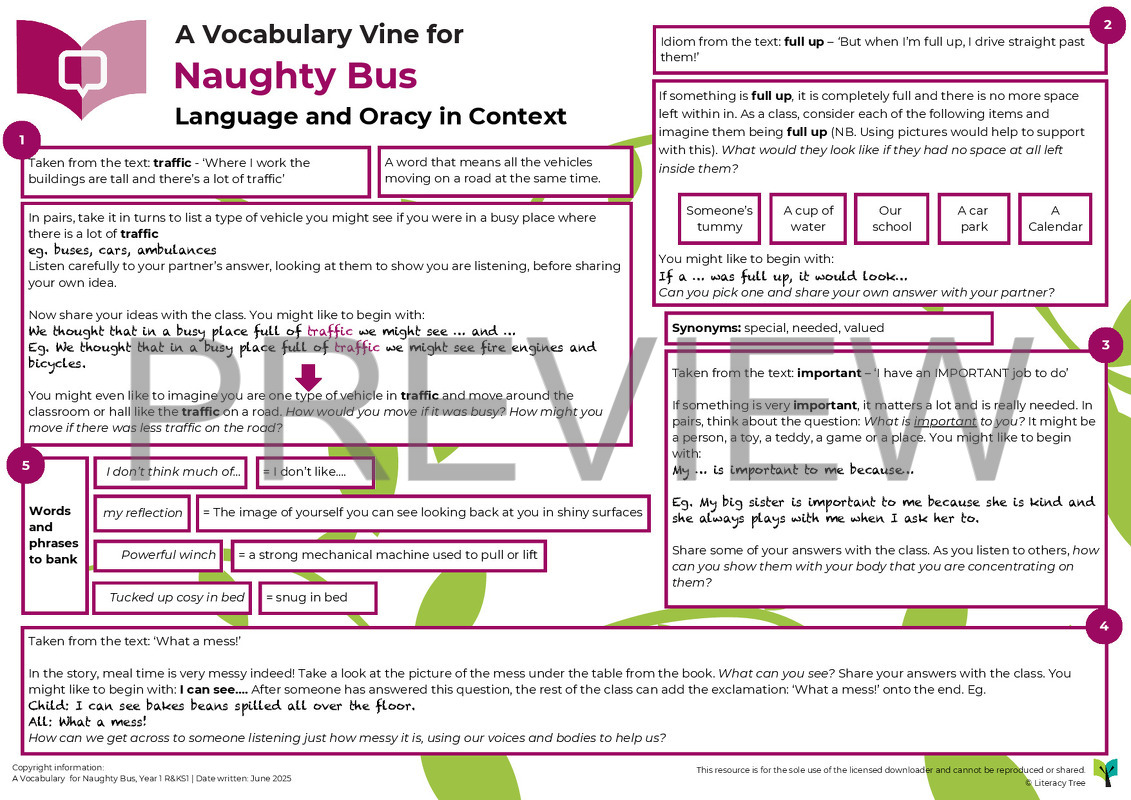 A Vocabulary Vine is designed to be a sister resource to a Writing Root and Spelling Seed. It sits within our wider Teach Through a Text approach by explicitly identifying vocabulary from the book and providing additional opportunities for paired, small group and whole class experimentation with this vocabulary in context. Vocabulary Vines further complement spelling development too through exploration of the morphology (word structure) and etymology (origins) of words. They also provide oracy opportunities through a focus on talk tasks and on oral sentence construction. They are designed for short burst oral and vocabulary development.