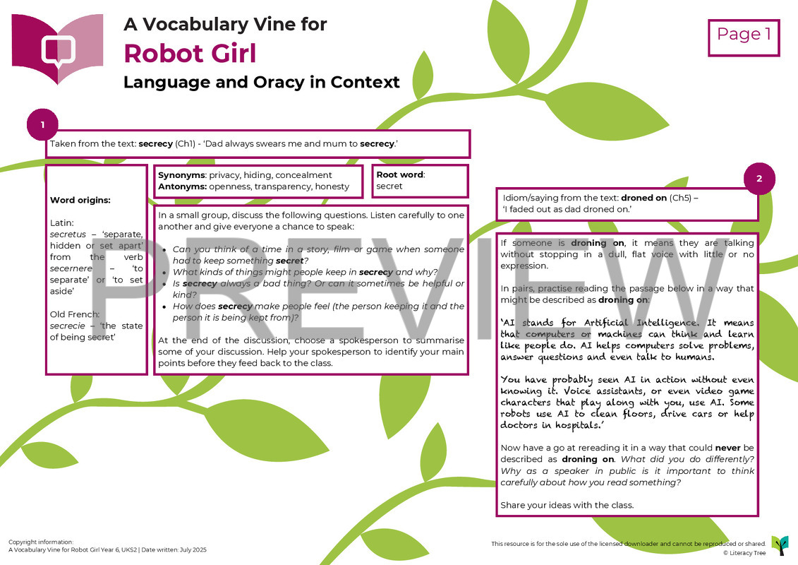 A Vocabulary Vine is designed to be a sister resource to a Writing Root and Spelling Seed. It sits within our wider Teach Through a Text approach by explicitly identifying vocabulary from the book and providing additional opportunities for paired, small group and whole class experimentation with this vocabulary in context. Vocabulary Vines further complement spelling development too through exploration of the morphology (word structure) and etymology (origins) of words. They also provide oracy opportunities through a focus on talk tasks and on oral sentence construction. They are designed for short burst oral and vocabulary development.