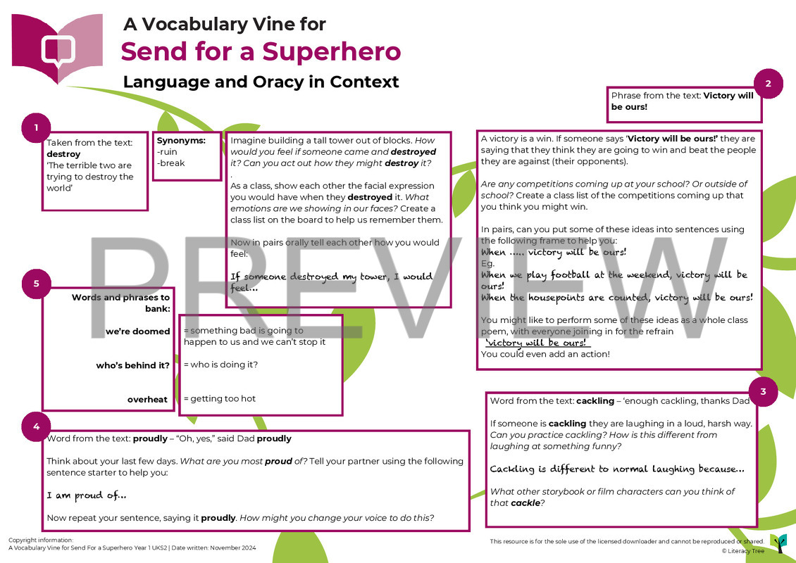 A Vocabulary Vine is designed to be a sister resource to a Writing Root and Spelling Seed. It sits within our wider Teach Through a Text approach by explicitly identifying vocabulary from the book and providing additional opportunities for paired, small group and whole class experimentation with this vocabulary in context. Vocabulary Vines further complement spelling development too through exploration of the morphology (word structure) and etymology (origins) of words. They also provide oracy opportunities through a focus on talk tasks and on oral sentence construction. They are designed for short burst oral and vocabulary development.