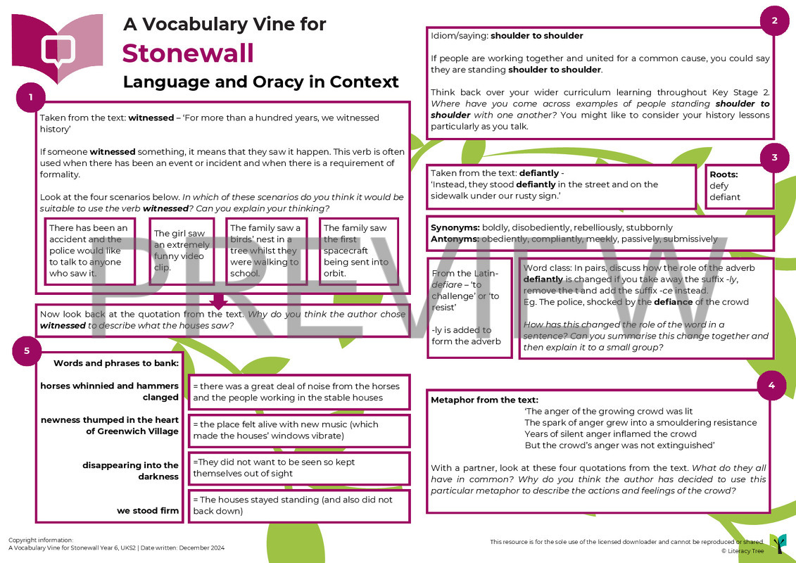 A Vocabulary Vine is designed to be a sister resource to a Writing Root and Spelling Seed. It sits within our wider Teach Through a Text approach by explicitly identifying vocabulary from the book and providing additional opportunities for paired, small group and whole class experimentation with this vocabulary in context. Vocabulary Vines further complement spelling development too through exploration of the morphology (word structure) and etymology (origins) of words. They also provide oracy opportunities through a focus on talk tasks and on oral sentence construction. They are designed for short burst oral and vocabulary development