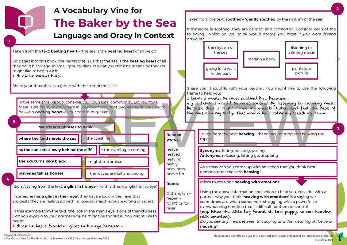 A Vocabulary Vine is designed to be a sister resource to a Writing Root and Spelling Seed. It sits within our wider Teach Through a Text approach by explicitly identifying vocabulary from the book and providing additional opportunities for paired, small group and whole class experimentation with this vocabulary in context. Vocabulary Vines further complement spelling development too through exploration of the morphology (word structure) and etymology (origins) of words. They also provide oracy opportunities through a focus on talk tasks and on oral sentence construction. They are designed for short burst oral and vocabulary development.