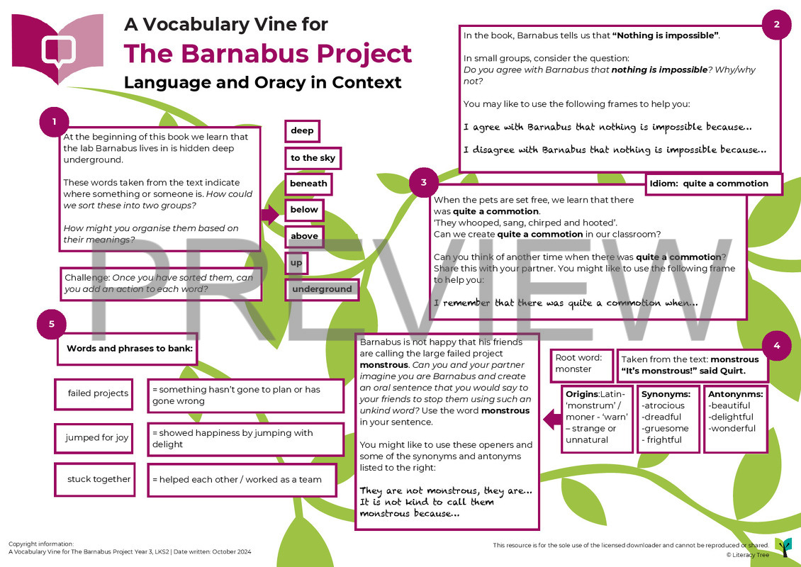 A Vocabulary Vine is designed to be a sister resource to a Writing Root and Spelling Seed. It sits within our wider Teach Through a Text approach by explicitly identifying vocabulary from the book and providing additional opportunities for paired, small group and whole class experimentation with this vocabulary in context. Vocabulary Vines further complement spelling development too through exploration of the morphology (word structure) and etymology (origins) of words. They also provide oracy opportunities through a focus on talk tasks and on oral sentence construction. They are designed for short burst oral and vocabulary development.