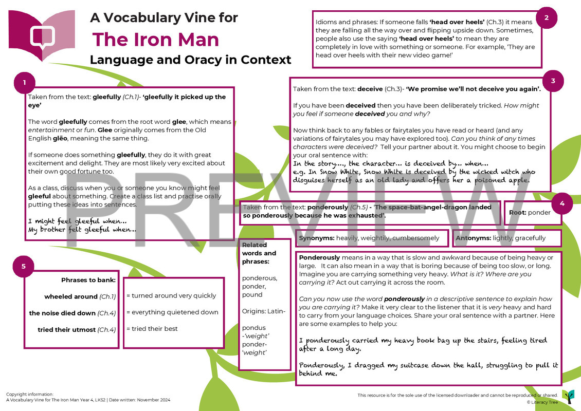 A Vocabulary Vine is designed to be a sister resource to a Writing Root and Spelling Seed. It sits within our wider Teach Through a Text approach by explicitly identifying vocabulary from the book and providing additional opportunities for paired, small group and whole class experimentation with this vocabulary in context. Vocabulary Vines further complement spelling development too through exploration of the morphology (word structure) and etymology (origins) of words. They also provide oracy opportunities through a focus on talk tasks and on oral sentence construction. They are designed for short burst oral and vocabulary development.
