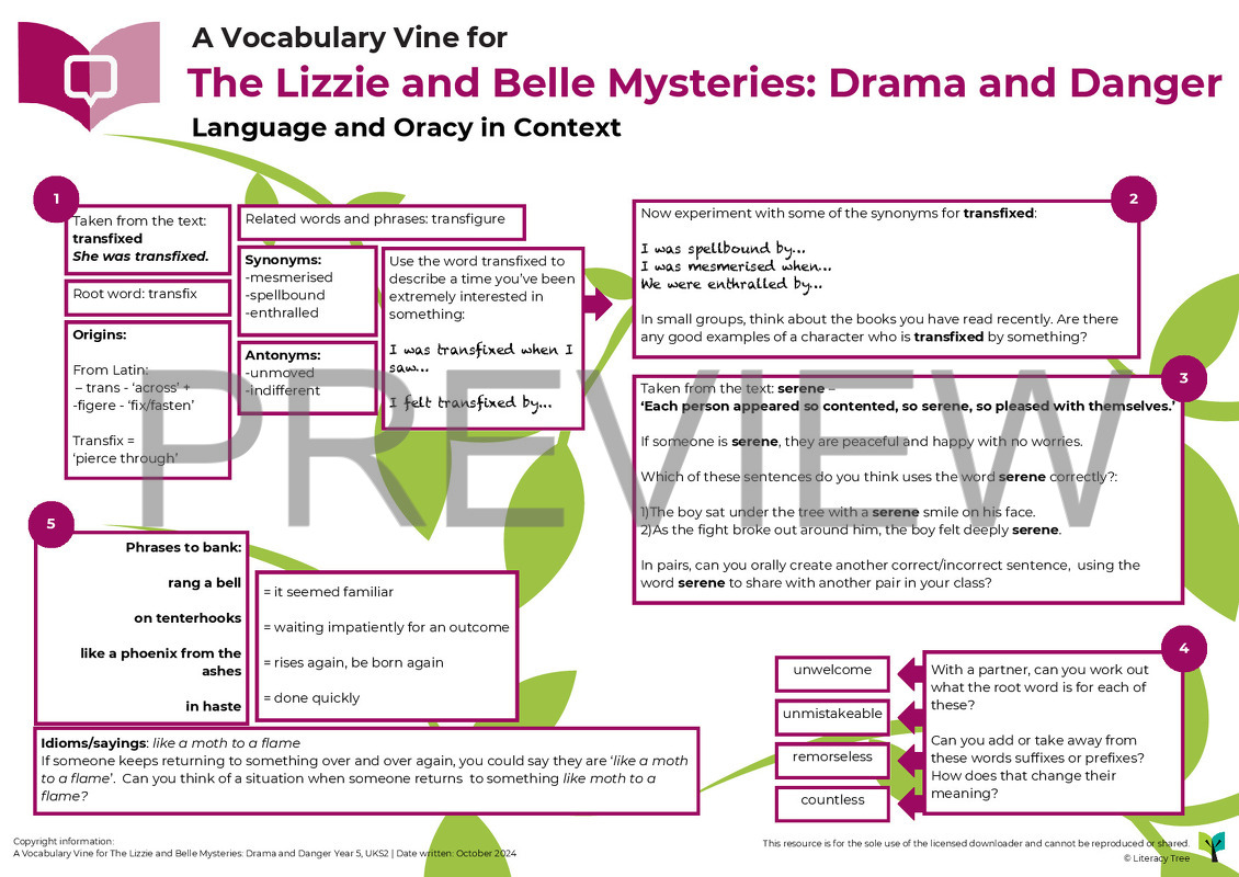 A Vocabulary Vine is designed to be a sister resource to a Writing Root and Spelling Seed. It sits within our wider Teach Through a Text approach by explicitly identifying vocabulary from the book and providing additional opportunities for paired, small group and whole class experimentation with this vocabulary in context. Vocabulary Vines further complement spelling development too through exploration of the morphology (word structure) and etymology (origins) of words. They also provide oracy opportunities through a focus on talk tasks and on oral sentence construction. They are designed for short burst oral and vocabulary development