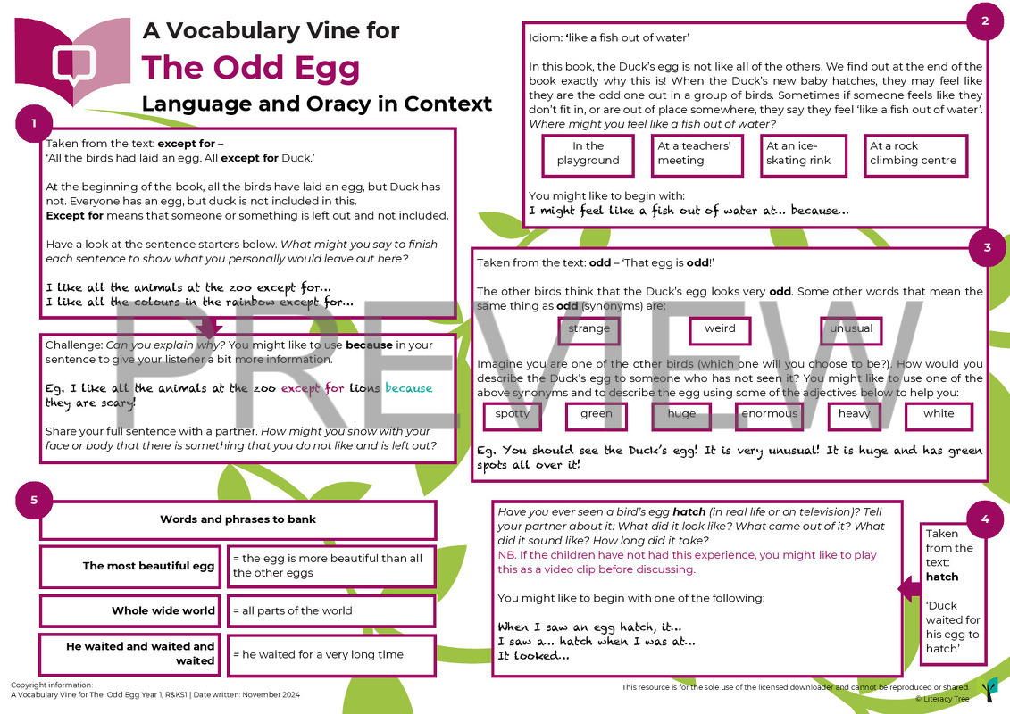 A Vocabulary Vine is designed to be a sister resource to a Writing Root and Spelling Seed. It sits within our wider Teach Through a Text approach by explicitly identifying vocabulary from the book and providing additional opportunities for paired, small group and whole class experimentation with this vocabulary in context. Vocabulary Vines further complement spelling development too through exploration of the morphology (word structure) and etymology (origins) of words. They also provide oracy opportunities through a focus on talk tasks and on oral sentence construction. They are designed for short burst oral and vocabulary development.