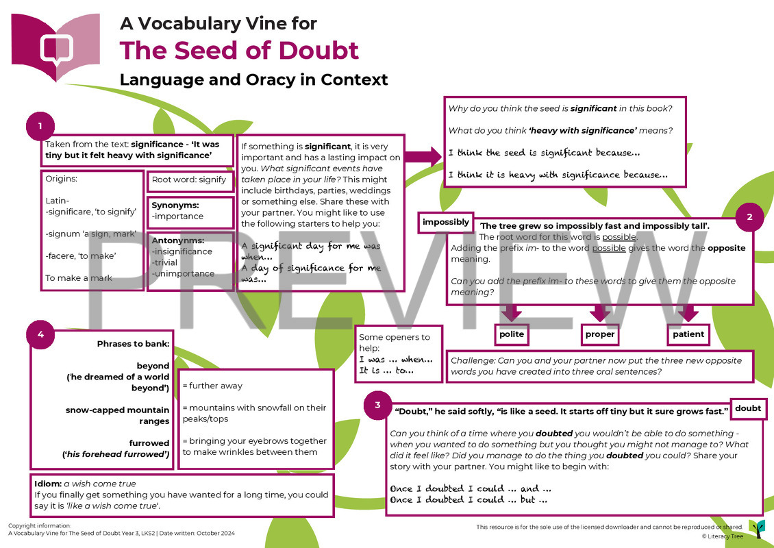 A Vocabulary Vine is designed to be a sister resource to a Writing Root and Spelling Seed. It sits within our wider Teach Through a Text approach by explicitly identifying vocabulary from the book and providing additional opportunities for paired, small group and whole class experimentation with this vocabulary in context. Vocabulary Vines further complement spelling development too through exploration of the morphology (word structure) and etymology (origins) of words. They also provide oracy opportunities through a focus on talk tasks and on oral sentence construction. They are designed for short burst oral and vocabulary development