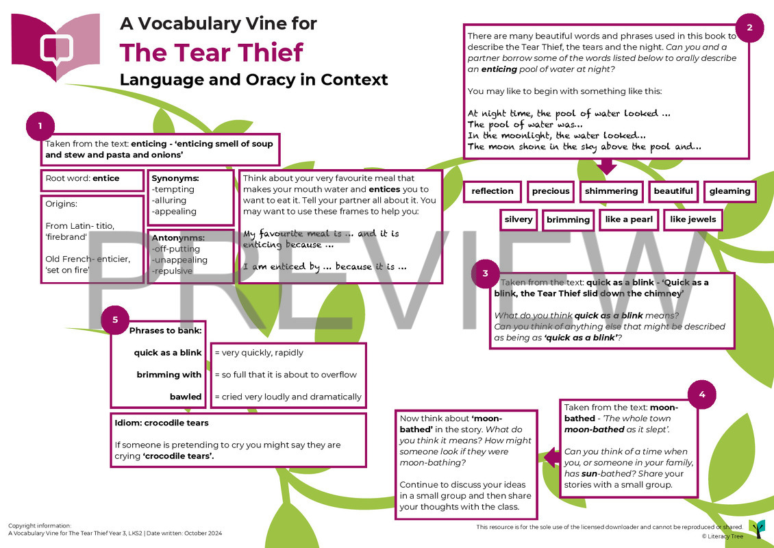 A Vocabulary Vine is designed to be a sister resource to a Writing Root and Spelling Seed. It sits within our wider Teach Through a Text approach by explicitly identifying vocabulary from the book and providing additional opportunities for paired, small group and whole class experimentation with this vocabulary in context. Vocabulary Vines further complement spelling development too through exploration of the morphology (word structure) and etymology (origins) of words. They also provide oracy opportunities through a focus on talk tasks and on oral sentence construction. They are designed for short burst oral and vocabulary development.