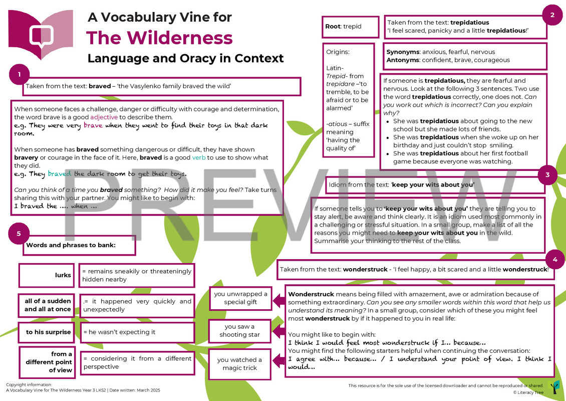 A Vocabulary Vine is designed to be a sister resource to a Writing Root and Spelling Seed. It sits within our wider Teach Through a Text approach by explicitly identifying vocabulary from the book and providing additional opportunities for paired, small group and whole class experimentation with this vocabulary in context. Vocabulary Vines further complement spelling development too through exploration of the morphology (word structure) and etymology (origins) of words. They also provide oracy opportunities through a focus on talk tasks and on oral sentence construction. They are designed for short burst oral and vocabulary development