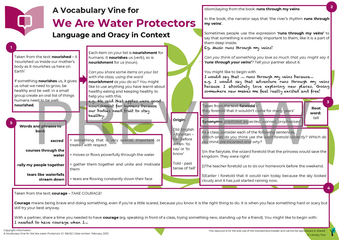 A Vocabulary Vine is designed to be a sister resource to a Writing Root and Spelling Seed. It sits within our wider Teach Through a Text approach by explicitly identifying vocabulary from the book and providing additional opportunities for paired, small group and whole class experimentation with this vocabulary in context. Vocabulary Vines further complement spelling development too through exploration of the morphology (word structure) and etymology (origins) of words. They also provide oracy opportunities through a focus on talk tasks and on oral sentence construction. They are designed for short burst oral and vocabulary development.