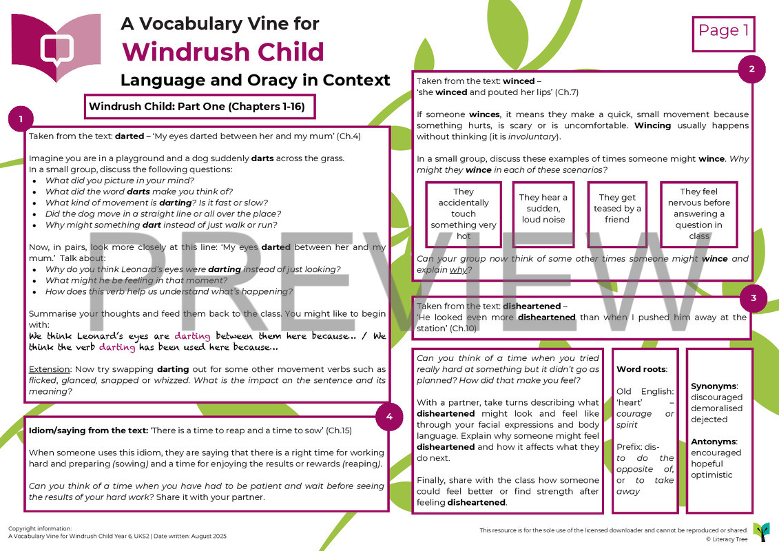 A Vocabulary Vine is designed to be a sister resource to a Writing Root and Spelling Seed. It sits within our wider Teach Through a Text approach by explicitly identifying vocabulary from the book and providing additional opportunities for paired, small group and whole class experimentation with this vocabulary in context. Vocabulary Vines further complement spelling development too through exploration of the morphology (word structure) and etymology (origins) of words. They also provide oracy opportunities through a focus on talk tasks and on oral sentence construction. They are designed for short burst oral and vocabulary development