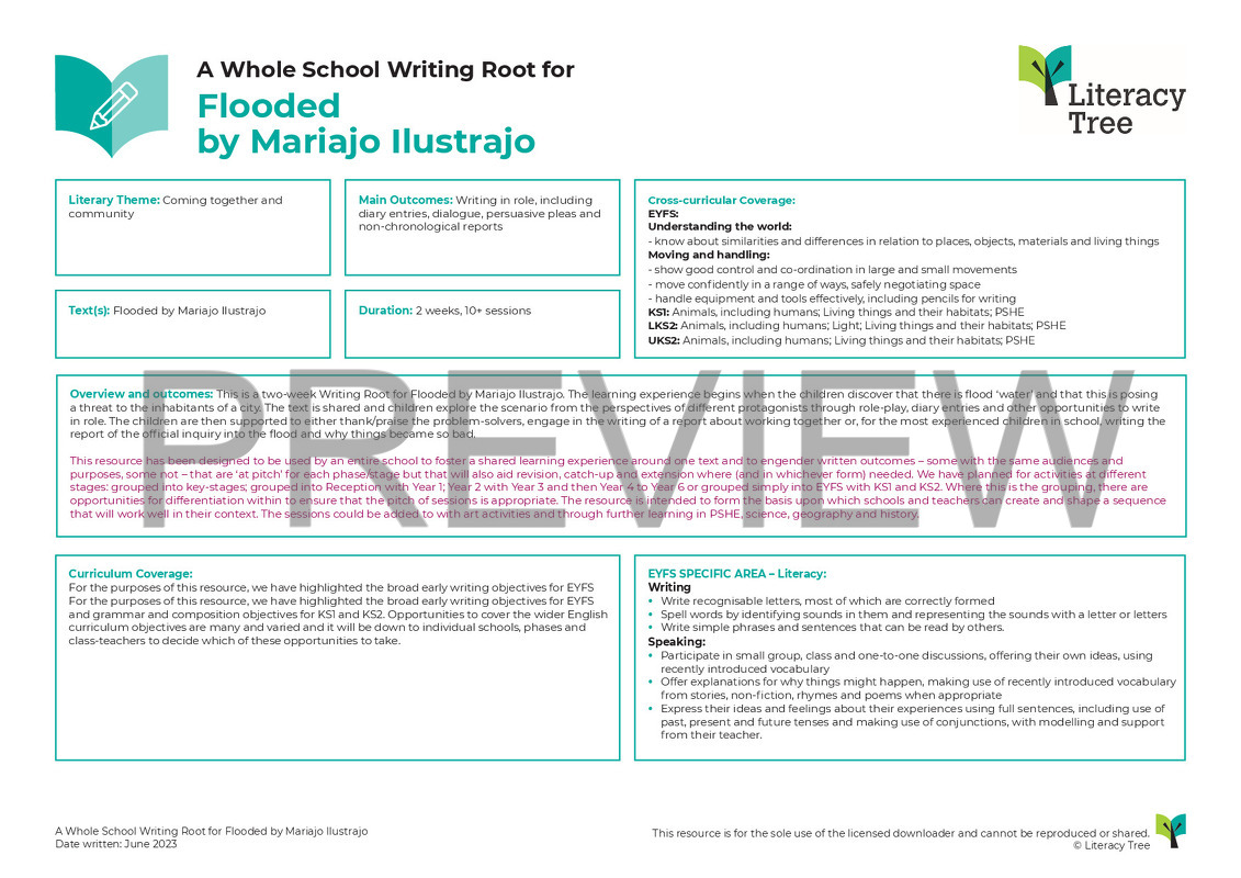 This is a two-week Writing Root for Flooded by Mariajo Ilustrajo. The learning experience begins when the children discover that there is flood ‘water’ and that this is posing a threat to the inhabitants of a city. The text is shared and children explore the scenario from the perspectives of different protagonists through role-play, diary entries and other opportunities to write in role. The children are then supported to either thank/praise the problem-solvers, engage in the writing of a report about working together or, for the most experienced children in school, writing the report of the official inquiry into the flood and why things became so bad.