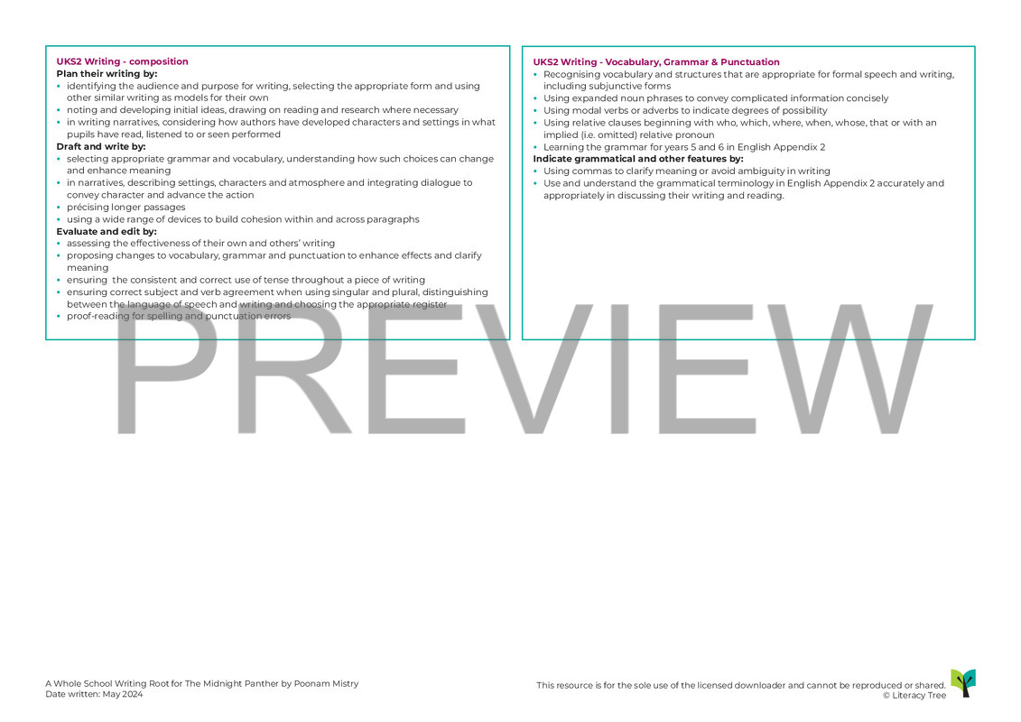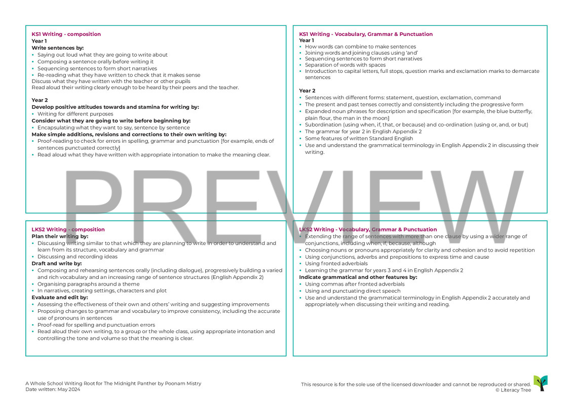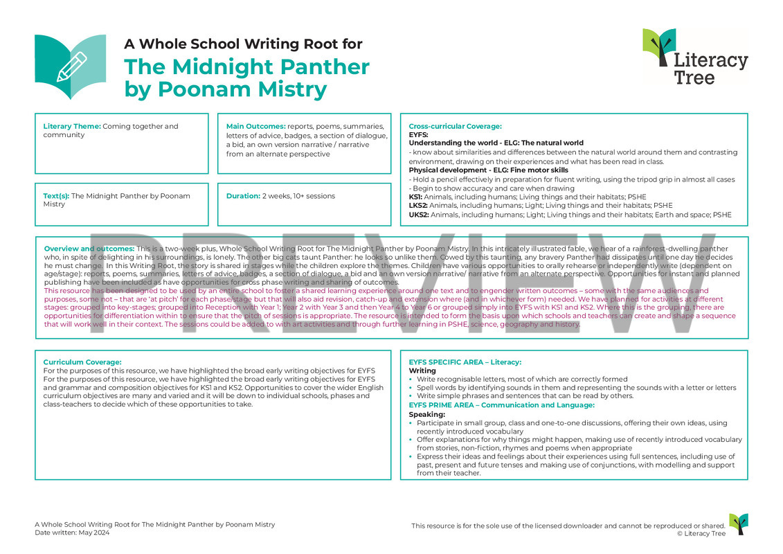 This is a two-week plus, Whole School Writing Root for The Midnight Panther by Poonam Mistry. In this intricately illustrated fable, we hear of a rainforest-dwelling panther who, in spite of delighting in his surroundings, is lonely. The other big cats taunt Panther: he looks so unlike them. Cowed by this taunting, any bravery Panther had dissipates until one day he decides he must change. In this Writing Root, the story is shared in stages while the children explore the themes. Children have various opportunities to orally rehearse or independently write (dependent on age/stage): reports, poems, summaries, letters of advice, badges, a section of dialogue, a bid and an own version narrative/ narrative from an alternate perspective. Opportunities for instant and planned publishing have been included as have opportunities for cross phase writing and sharing of outcomes.