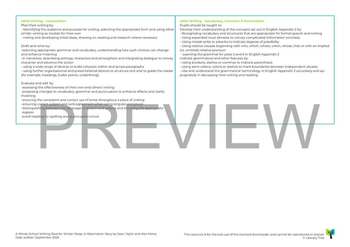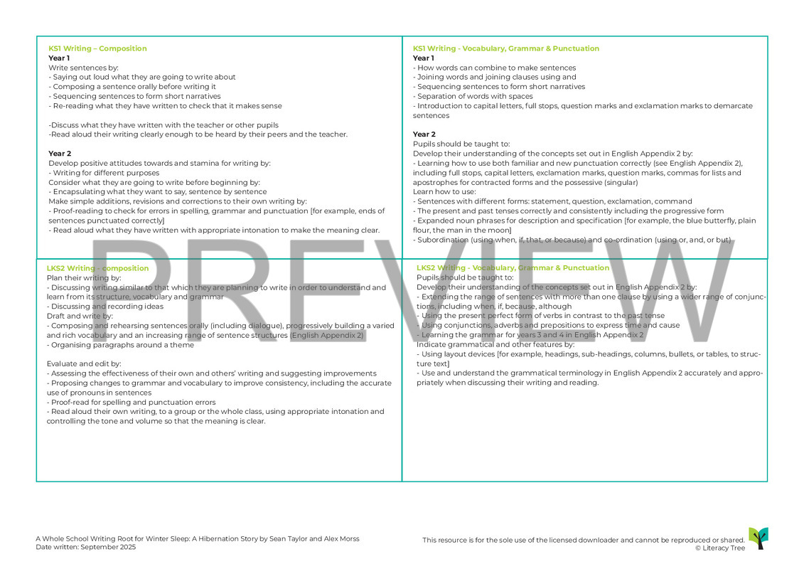 In this one-week writing root for ‘Winter Sleep: A Hibernation story’ the children will begin by discovering a secret glade and all the wonders of nature that lie within it. Together they will explore the glade, identifying signs of nature. They will develop their understanding of animals’ homes, including mammals, amphibians and mini-beasts. Once their journey as nature experts has begun, they will create poetry using the rich and varied vocabulary based around the theme of nature. Finally, they will take their nature knowledge and create explanation texts for the subject of hibernation, using the text as a high quality modelled example. Through the text they will develop their knowledge as nature experts, as well as a sense of awe and wonder for the magic