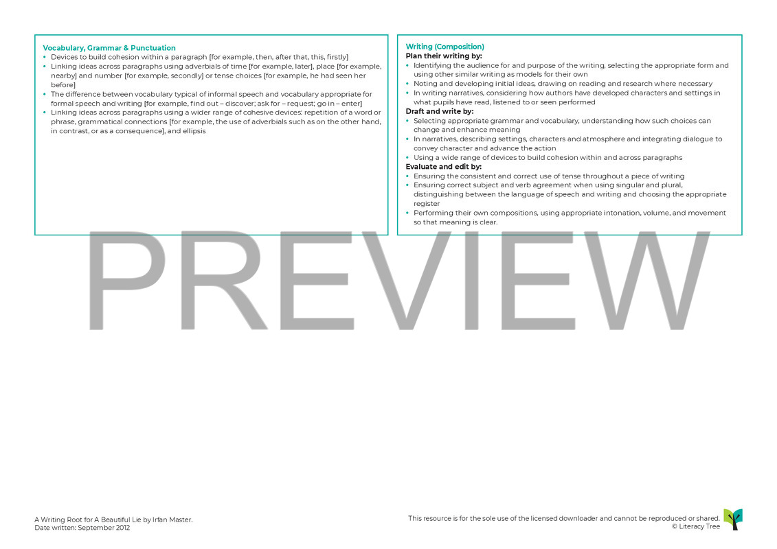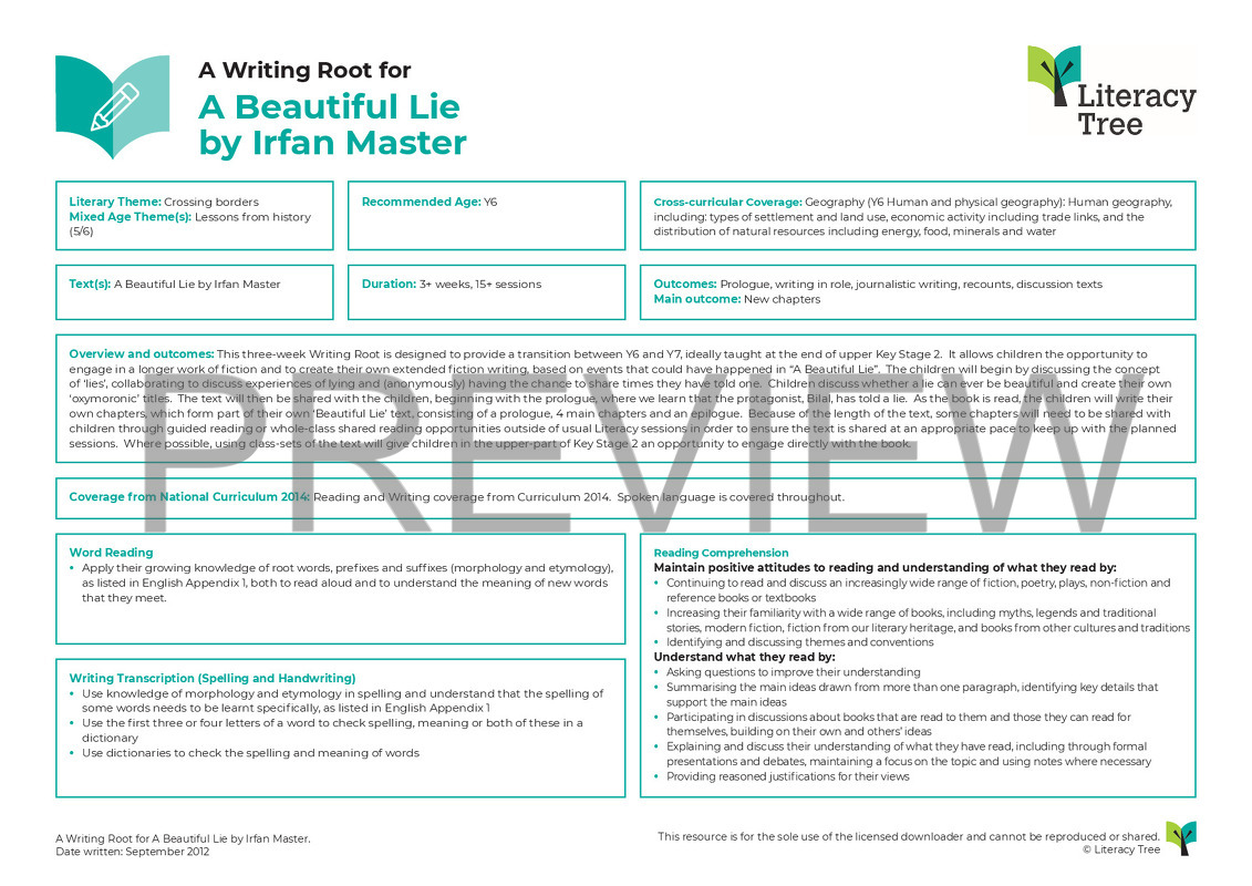 This three-week Writing Root is designed to provide a transition between Y6 and Y7, ideally taught at the end of upper Key Stage 2. It allows children the opportunity to engage in a longer work of fiction and to create their own extended fiction writing, based on events that could have happened in “A Beautiful Lie”. The children will begin by discussing the concept of ‘lies’, collaborating to discuss experiences of lying and (anonymously) having the chance to share times they have told one. Children discuss whether a lie can ever be beautiful and create their own ‘oxymoronic’ titles. The text will then be shared with the children, beginning with the prologue, where we learn that the protagonist, Bilal, has told a lie. As the book is read, the children will write their own chapters, which form part of their own ‘Beautiful Lie’ text, consisting of a prologue, 4 main chapters and an epilogue. Because of the length of the text, some chapters will need to be shared with children through guided reading or whole-class shared reading opportunities outside of usual Literacy sessions in order to ensure the text is shared at an appropriate pace to keep up with the planned sessions. Where possible, using class-sets of the text will give children in the upper-part of Key Stage 2 an opportunity to engage directly with the book.