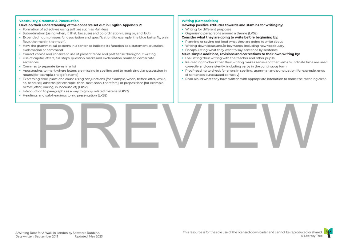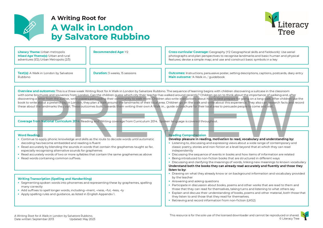 This is a three-week Writing Root for A Walk in London by Salvatore Rubbino. The sequence of learning begins with children discovering a suitcase in the classroom with some brochures and souvenirs from London. Can the children guess which city their teacher has walked around recently? Children go on to think about the importance of walking and, after discovering a letter from the author, write posters persuading their community to walk more. Children also write instructions about how to best prepare for going on a long walk. After children use the book to write about a pretend day in London, they plan a walk around the landmarks of their local area. Children go on the walk and write about this experience. They also can research facts and record these about the landmarks they visit. These outcomes build towards them writing their own A Walk in… guide or brochure for their local area to persuade people to come and visit.