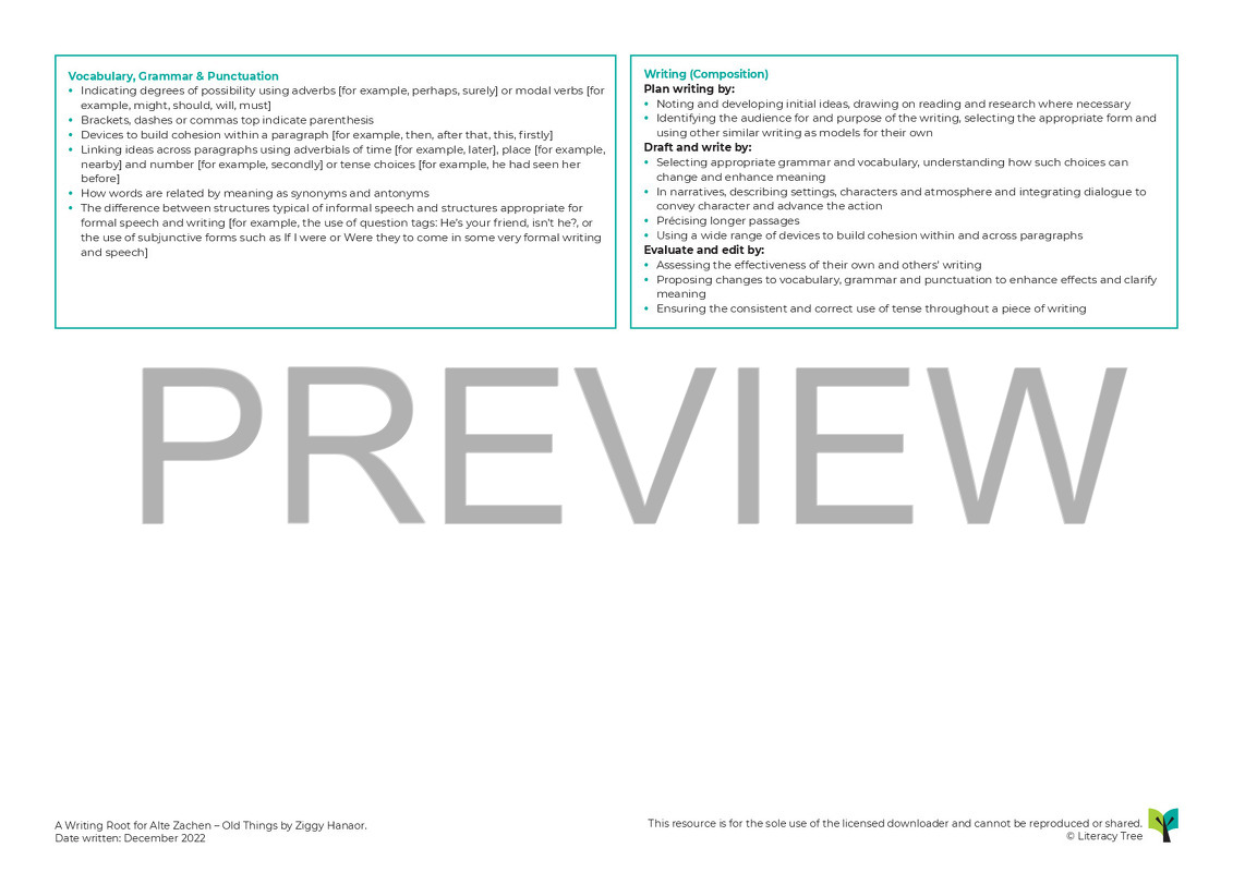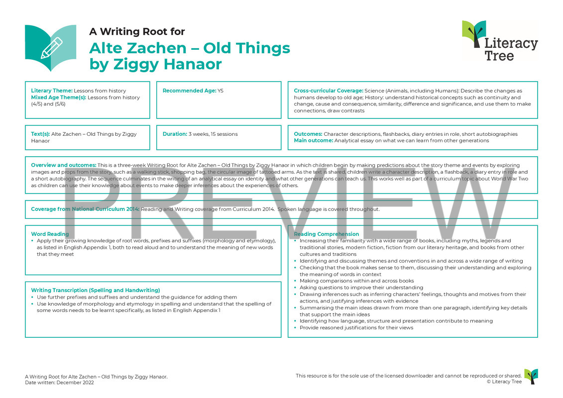 This is a three-week Writing Root for Alte Zachen: Old Things by Ziggy Hanaor in which children begin by making predictions about the story theme and events by exploring images and props from the story, such as a walking stick, shopping bag, the circular image of tattooed arms. As the text is shared, children write a character description, a flashback, a diary entry in role and a short autobiography. The sequence of learning culminates in the writing of an analytical essay on identity and what other generations can teach us. This works well as part of a curriculum topic about World War Two as children can use their knowledge about events to make deeper inferences about the experiences of others.