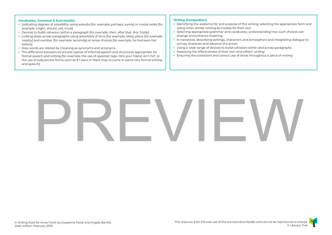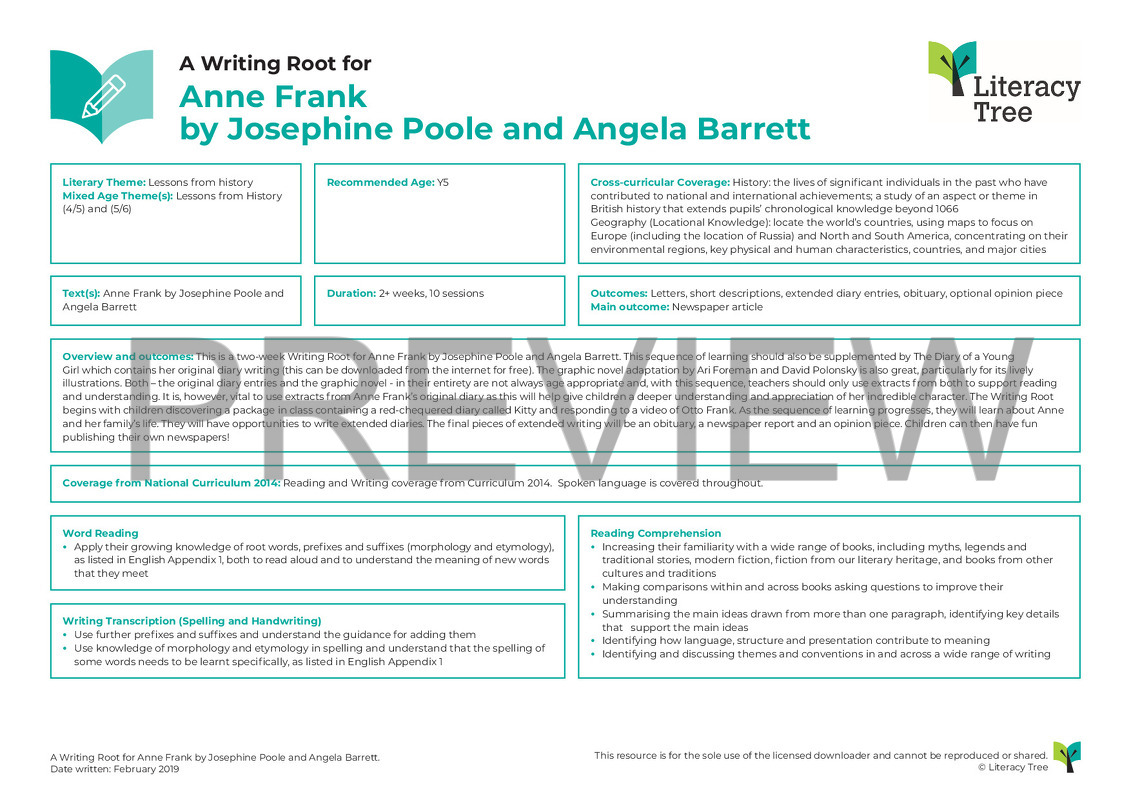 This is a two-week Writing Root for Anne Frank by Josephine Poole and Angela Barrett. This sequence of learning should also be supplemented by The Diary of a Young Girl which contains her original diary writing (this can be downloaded from the internet for free). The graphic novel adaptation by Ari Foreman and David Polonsky is also great, particularly for its lively illustrations. Both – the original diary entries and the graphic novel - in their entirety are not always age appropriate and, with this sequence, teachers should only use extracts from both to support reading and understanding. It is, however, vital to use extracts from Anne Frank’s original diary as this will help give children a deeper understanding and appreciation of her incredible character. The Writing Root begins with children discovering a package in class containing a red-chequered diary called Kitty and responding to a video of Otto Frank. As the sequence of learning progresses, they will learn about Anne and her family’s life. They will have opportunities to write extended diaries. The final pieces of extended writing will be an obituary, a newspaper report and an opinion piece. Children can then have fun publishing their own newspapers!