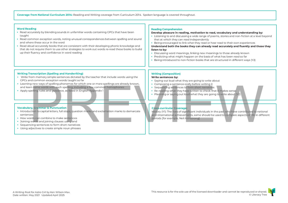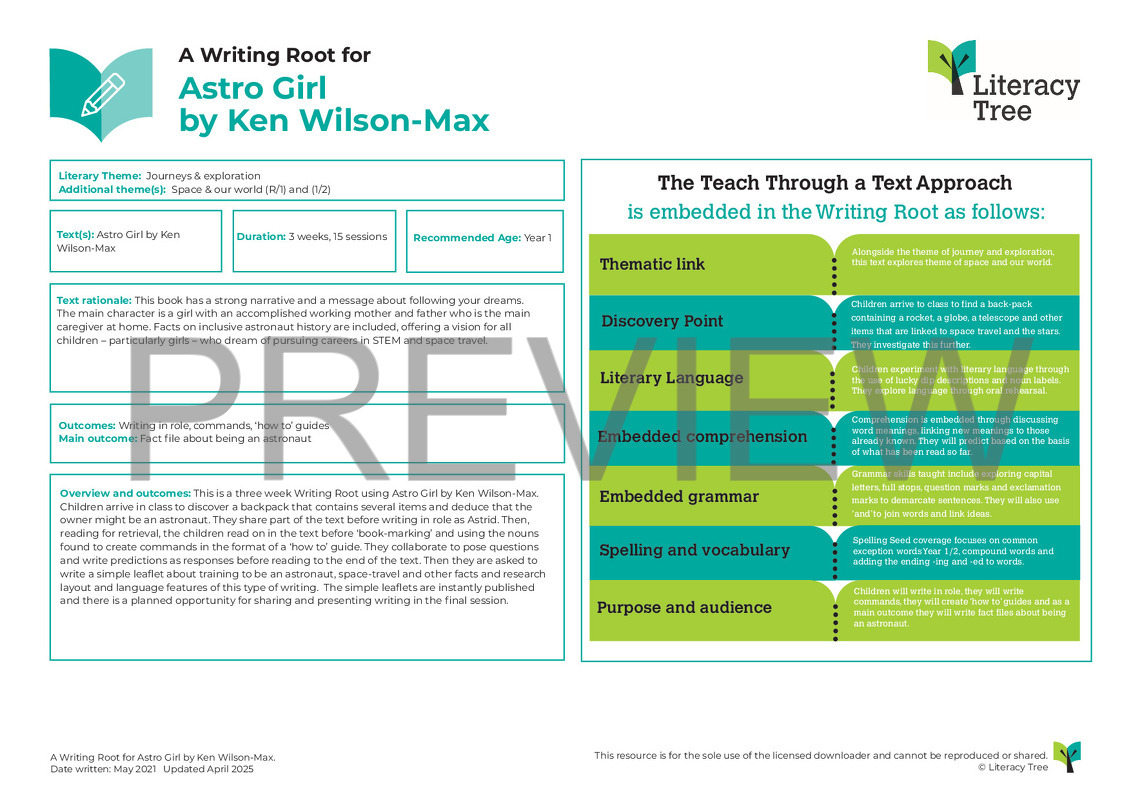 This is a three week Writing Root using Astro Girl by Ken Wilson-Max. Children arrive in class to discover a backpack that contains several items and deduce that the owner might be an astronaut. They share part of the text before writing in role as Astrid. Then, reading for retrieval, the children read on in the text before 'book-marking' and using the nouns found to create commands in the format of a 'hot to' guide. They collaborate to pose questions and write predictions as responses before reading to the end of the text. Then they re asked to write a simple leaflet about training to be an astronaut, space-travel and other facts and research layout and language feature of this type of writing. The simple leaflets are instantly published and there is planned opportunity for sharing and presenting writing in the final session.