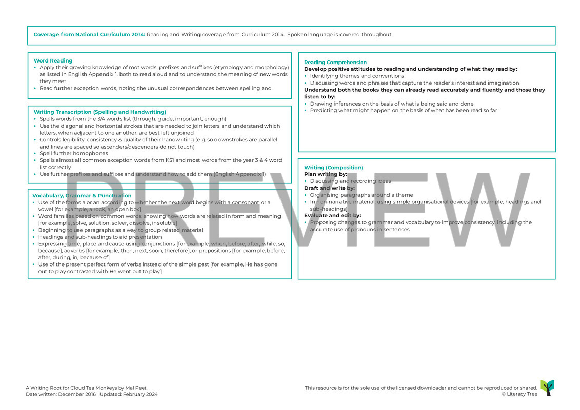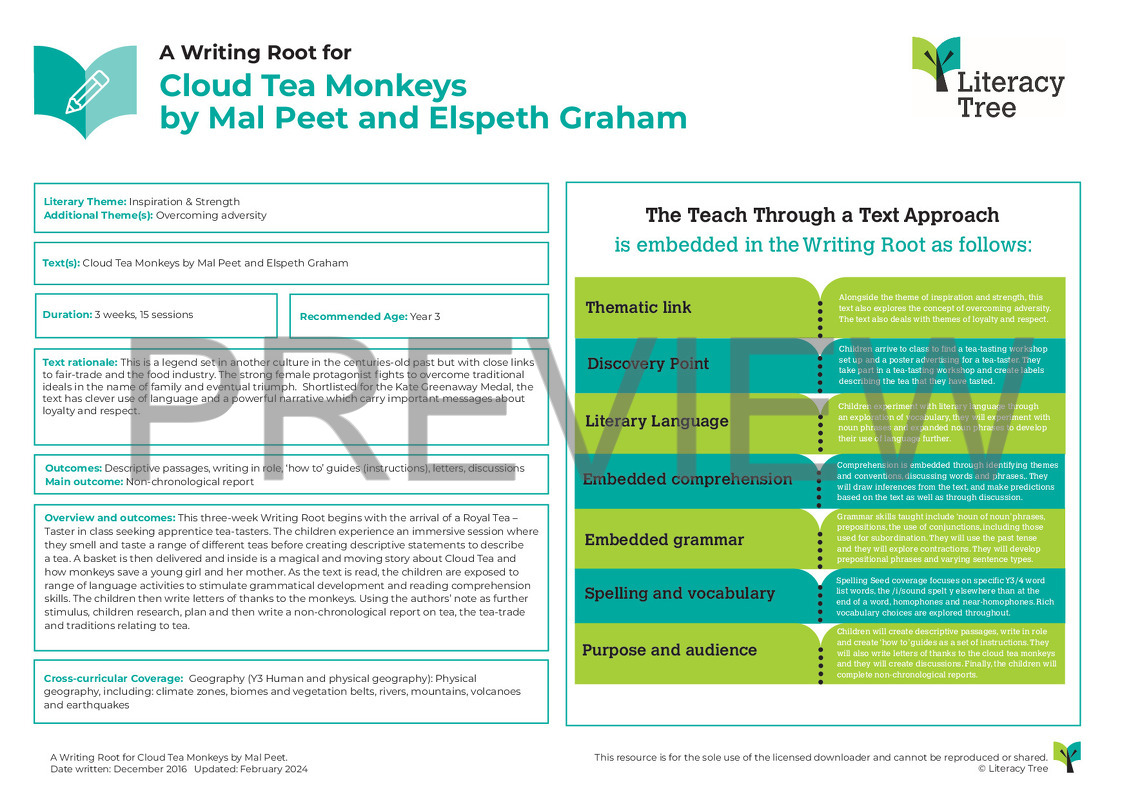 This three-week Writing Root begins with the arrival of a Royal Tea –Taster in class seeking apprentice tea-tasters. The children experience an immersive session where they smell and taste a range of different teas before creating descriptive statements to describe a tea. A basket is then delivered and inside is a magical and moving story about Cloud Tea and how monkeys save a young girl and her mother. As the text is read, the children are exposed to range of language activities to stimulate grammatical development and reading comprehension skills. The children then write letters of thanks to the monkeys. Using the authors’ note as further stimulus, children research, plan and then write a non-chronological report on tea, the tea-trade and traditions relating to tea.