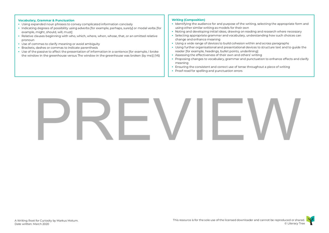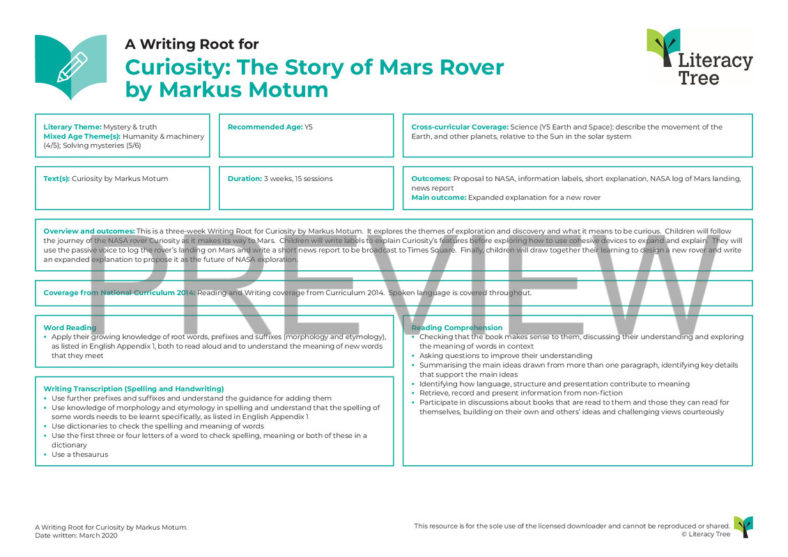 This is a three-week Writing Root for Curiosity: The Story of a Mars Rover by Markus Motum. It explores the themes of exploration and discovery and what it means to be curious. Children will follow the journey of the NASA rover Curiosity as it makes its way to Mars. Children will write labels to explain Curiosity’s features before exploring how to use cohesive devices to expand and explain. They will use the passive voice to log the rover’s landing on Mars and write a short news report to be broadcast to Times Square. Finally, children will draw together their learning to design a new rover and write an expanded explanation to propose it as the future of NASA exploration.