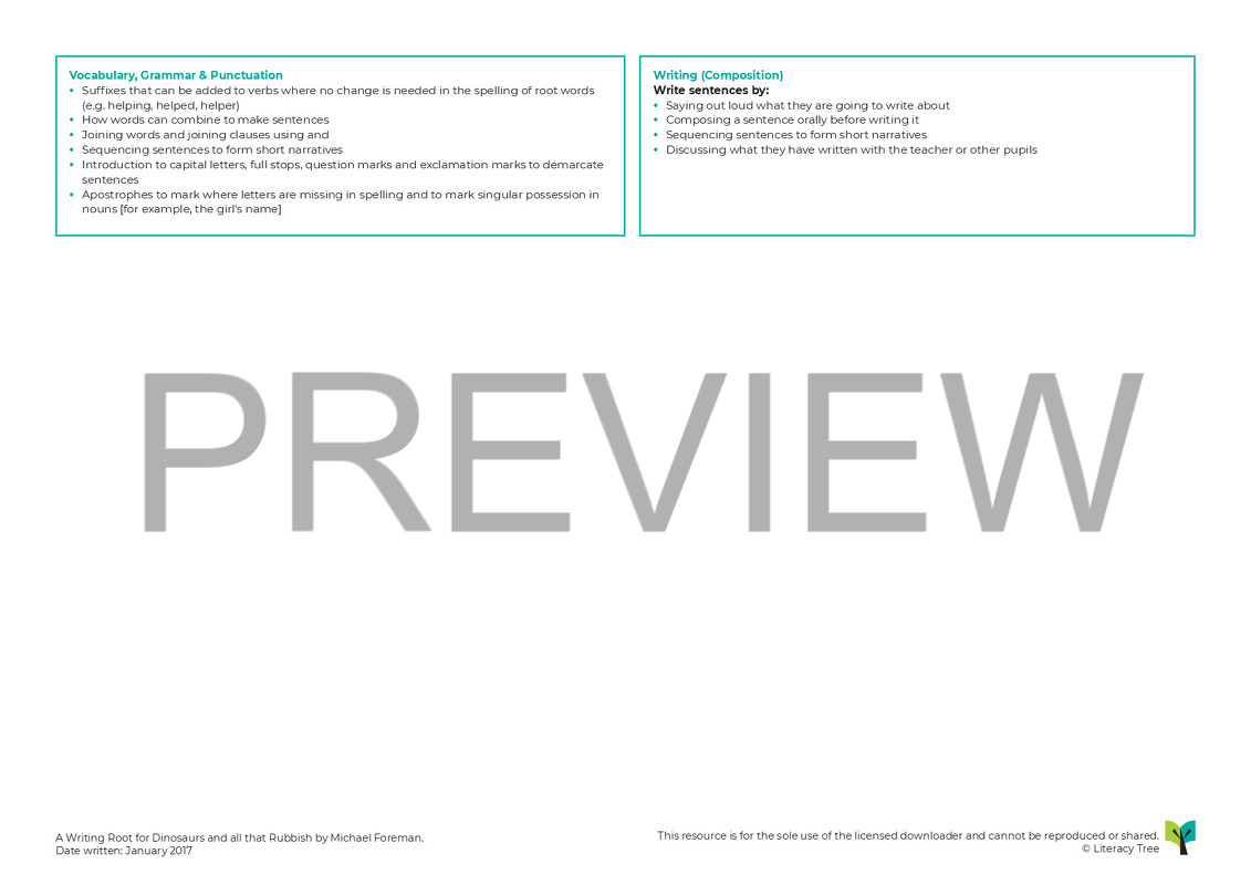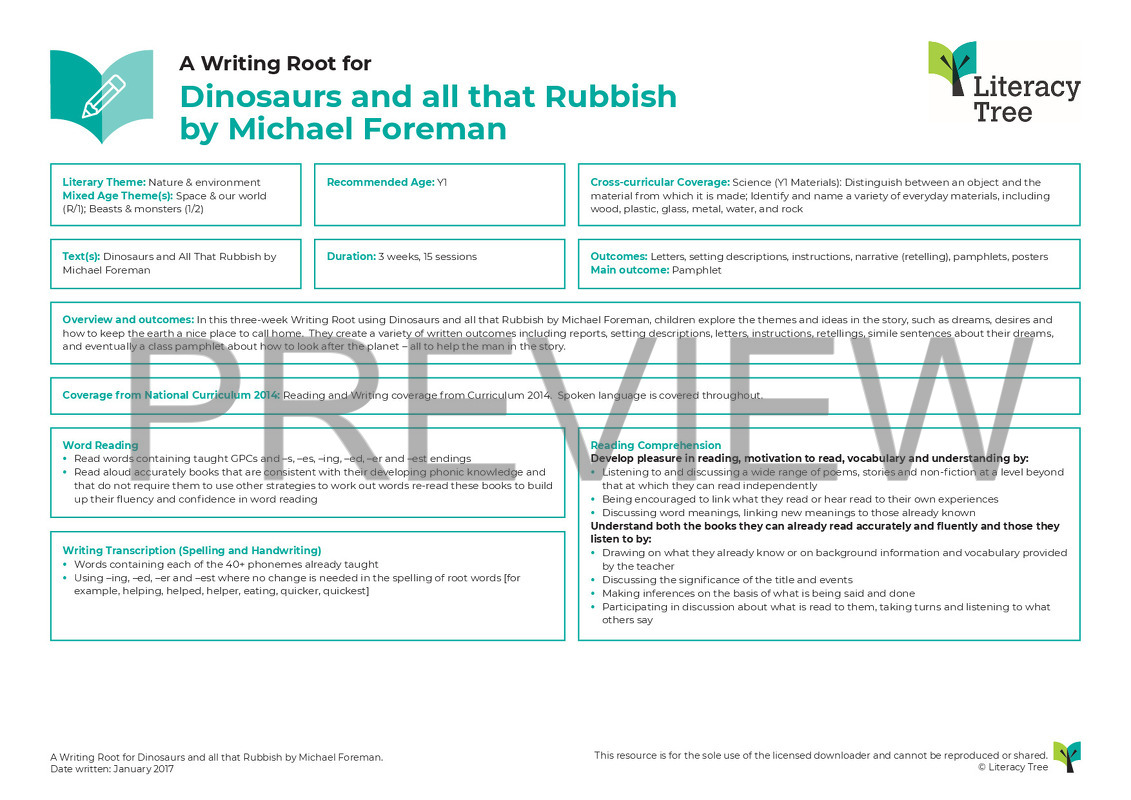 In this two-week Writing Root using Dinosaurs and all that Rubbish by Michael Foreman, children explore the themes and ideas in the story, such as dreams, desires and how to keep the earth a nice place to call home. They create a variety of written outcomes including reports, setting descriptions, letters, instructions, retellings and eventually a class pamphlet about how to look after the planet – all to help the man in the story. They also create sentences about their dreams and similes to share.