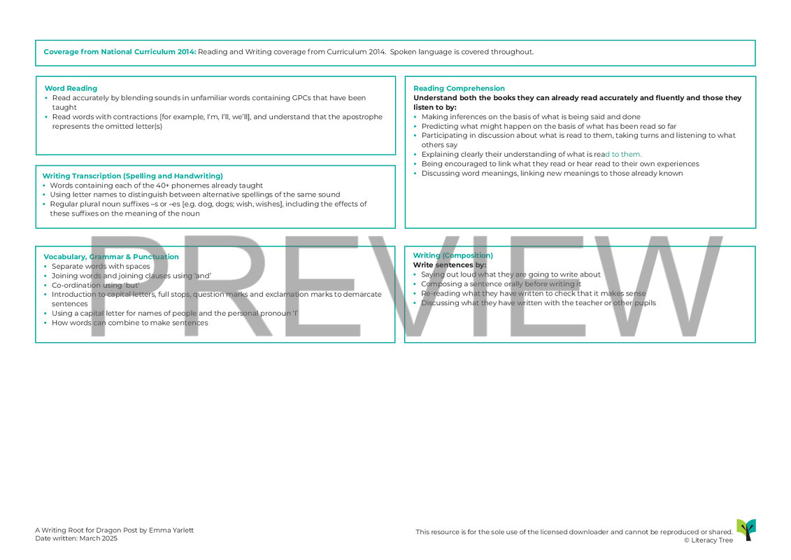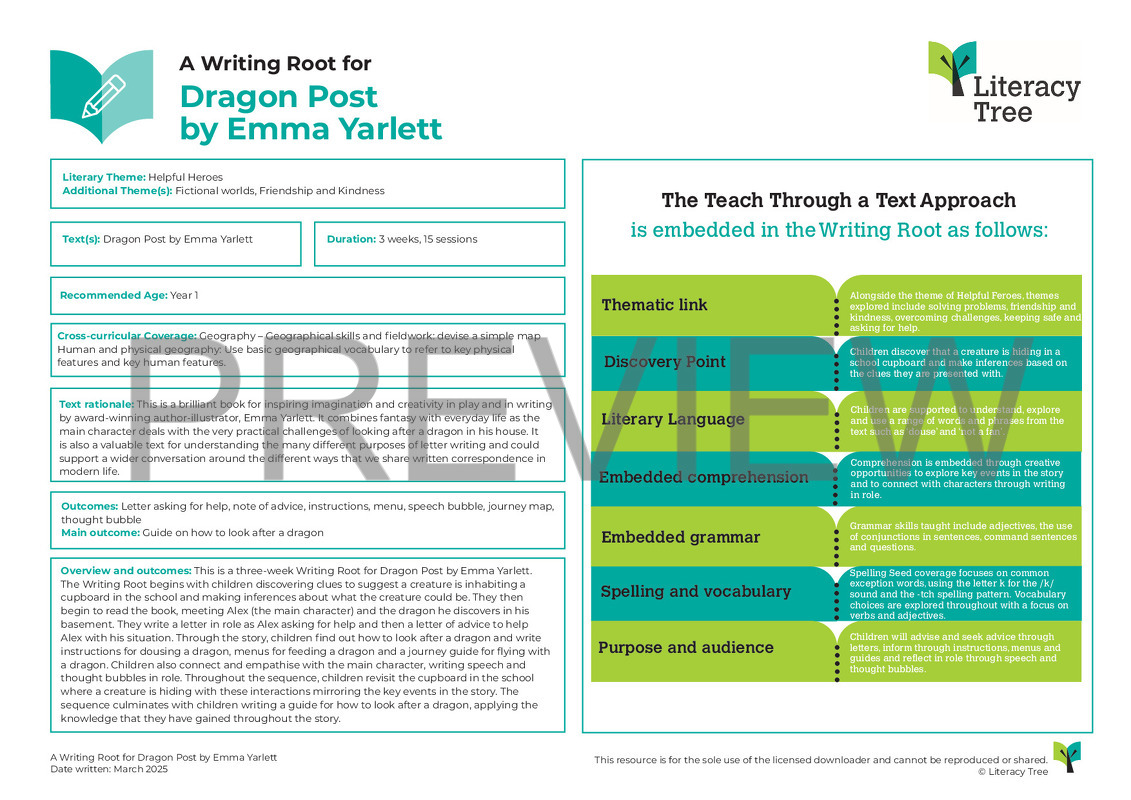 This is a three-week Writing Root for Dragon Post by Emma Yarlett. The Writing Root begins with children discovering clues to suggest a creature is inhabiting a cupboard in the school and making inferences about what the creature could be. They then begin to read the book, meeting Alex (the main character) and the dragon he discovers in his basement. They write a letter in role as Alex asking for help and then a letter of advice to help Alex with his situation. Through the story, children find out how to look after a dragon and write instructions for dousing a dragon, menus for feeding a dragon and a journey guide for flying with a dragon. Children also connect and empathise with the main character, writing speech and thought bubbles in role. Throughout the sequence, children revisit the cupboard in the school where a creature is hiding with these interactions mirroring the key events in the story. The sequence culminates with children writing a guide for how to look after a dragon, applying the knowledge that they have gained throughout the story.