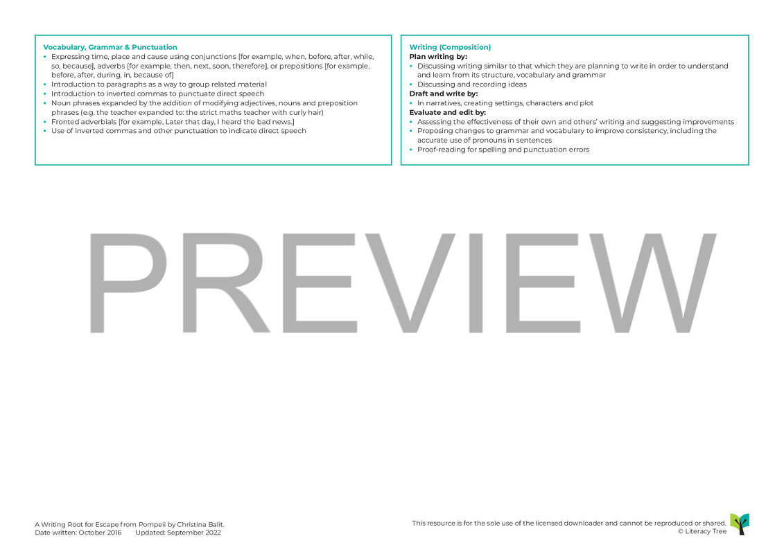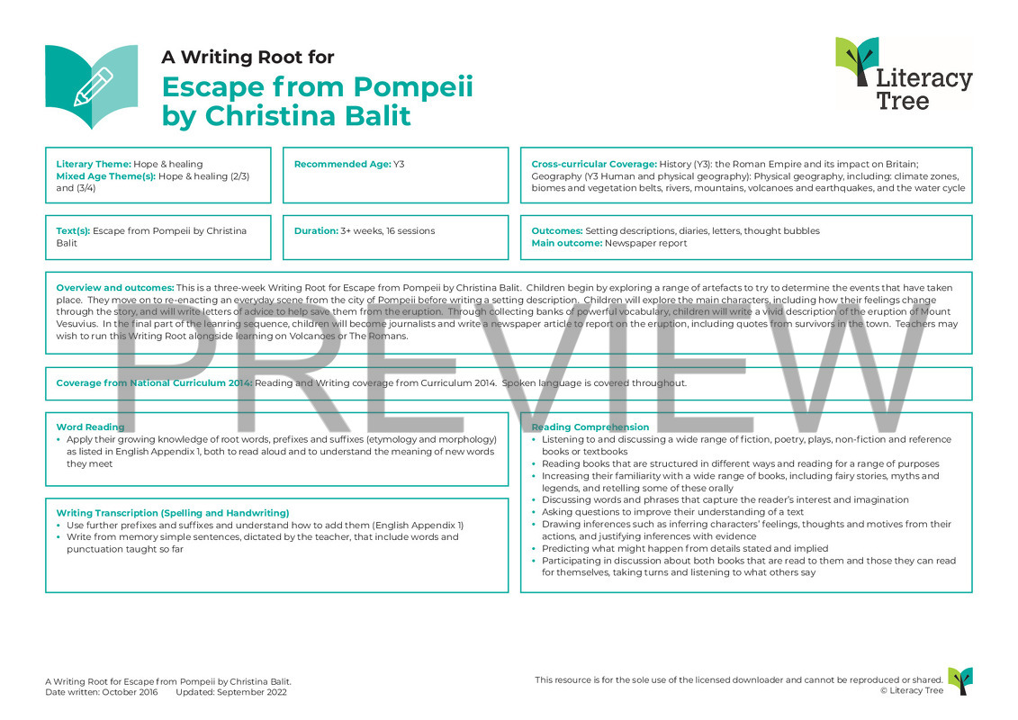 This is a three-week Writing Root for Escape from Pompeii by Christina Balit. Children begin by exploring a range of artefacts to try to determine the events that have taken place. They move on to re-enacting an everyday scene from the city of Pompeii before writing a setting description. Children will explore the main characters, including how their feelings change through the story, and will write letters of advice to help save them from the eruption. Through collecting banks of powerful vocabulary, children will write a vivid description of the eruption of Mount Vesuvius. In the final part of the sequence of learning, children will become journalists and write a newspaper article to report on the eruption, including quotes from survivors in the town. Teachers may wish to run this Writing Root alongside learning on Volcanoes or The Romans.