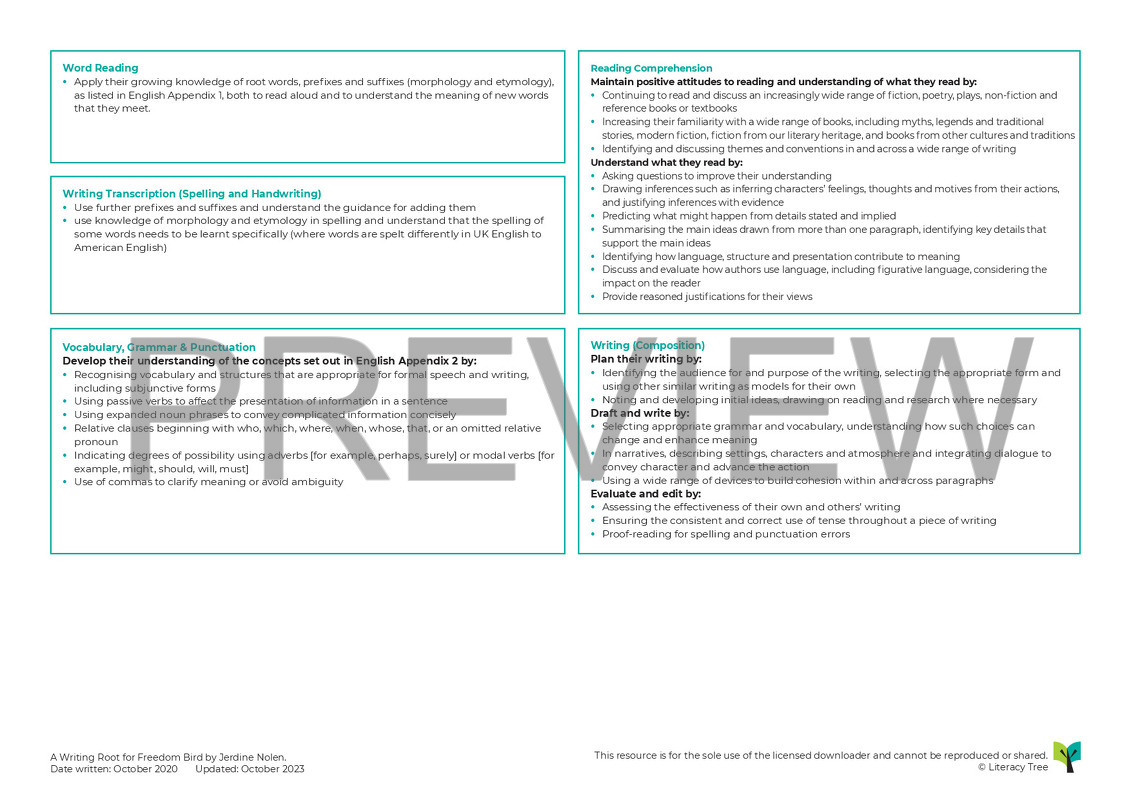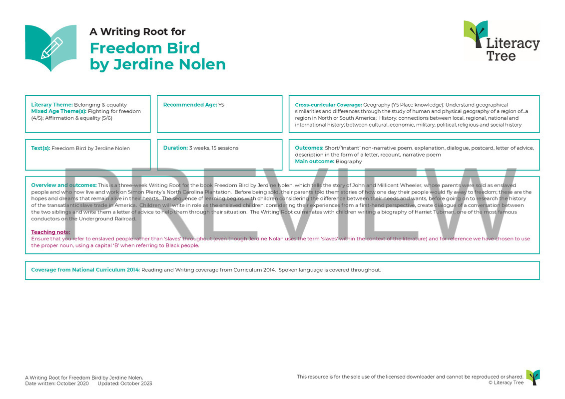 This is a three-week Writing Root for the book Freedom Bird by Jerdine Nolen, which tells the story of John and Millicent Wheeler, whose parents were sold as enslaved people and who now live and work on Simon Plenty’s North Carolina Plantation. Before being sold, their parents told them stories of how one day their people would fly away to freedom; these are the hopes and dreams that remain alive in their hearts. The sequence of learning begins with children considering the difference between their needs and wants, before going on to research the history of the transatlantic slave trade in America. Children will write in role as the enslaved children, considering their experiences from a first-hand perspective, create dialogue of a conversation between the two siblings and write them a letter of advice to help them through their situation. The Writing Root culminates with children writing a biography of Harriet Tubman, one of the most famous conductors on the Underground Railroad.