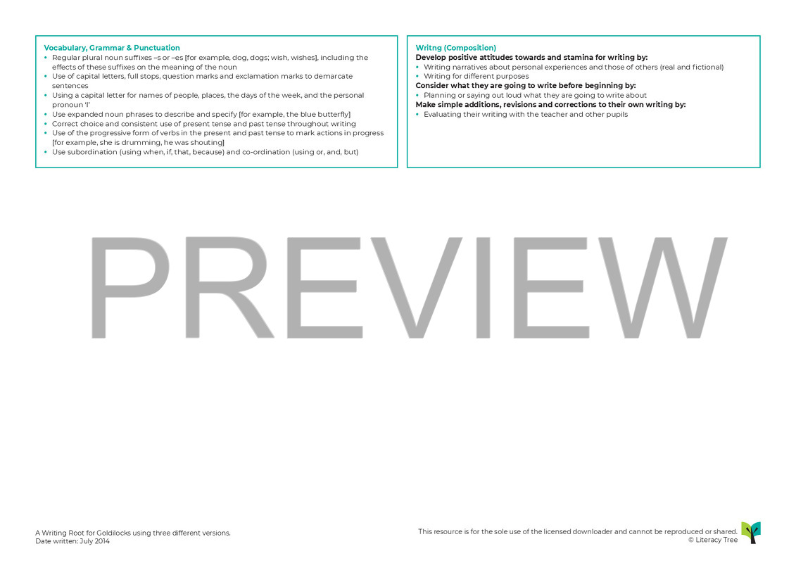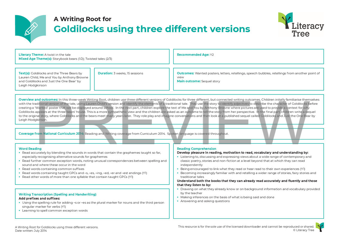 In this three-week Writing Root, children use three different versions of Goldilocks for three different, but connected writing outcomes. Children initially familiarise themselves with the traditional version of the tale, using Lauren Child’s version and identify the elements of a traditonal tale whilst identifying adjectives to describe the character of Goldilocks. They then use these to create a ‘Wanted’ poster that will be displayed around school. In the next part, children explore the text of Me and You by Anthony Browne where pictures are used to provide a context for why Goldilocks appears at the three bears house. This is a more sympathetic view and the children are asked as an outcome to tell the story from her perspective. In the final part, children write a sequel to the original story, where Goldilocks and the bears meet many years later and they role play and imagine conversations and then look at a published sequel called Goldilocks and Just the One Bear by Leigh Hodgkinson.