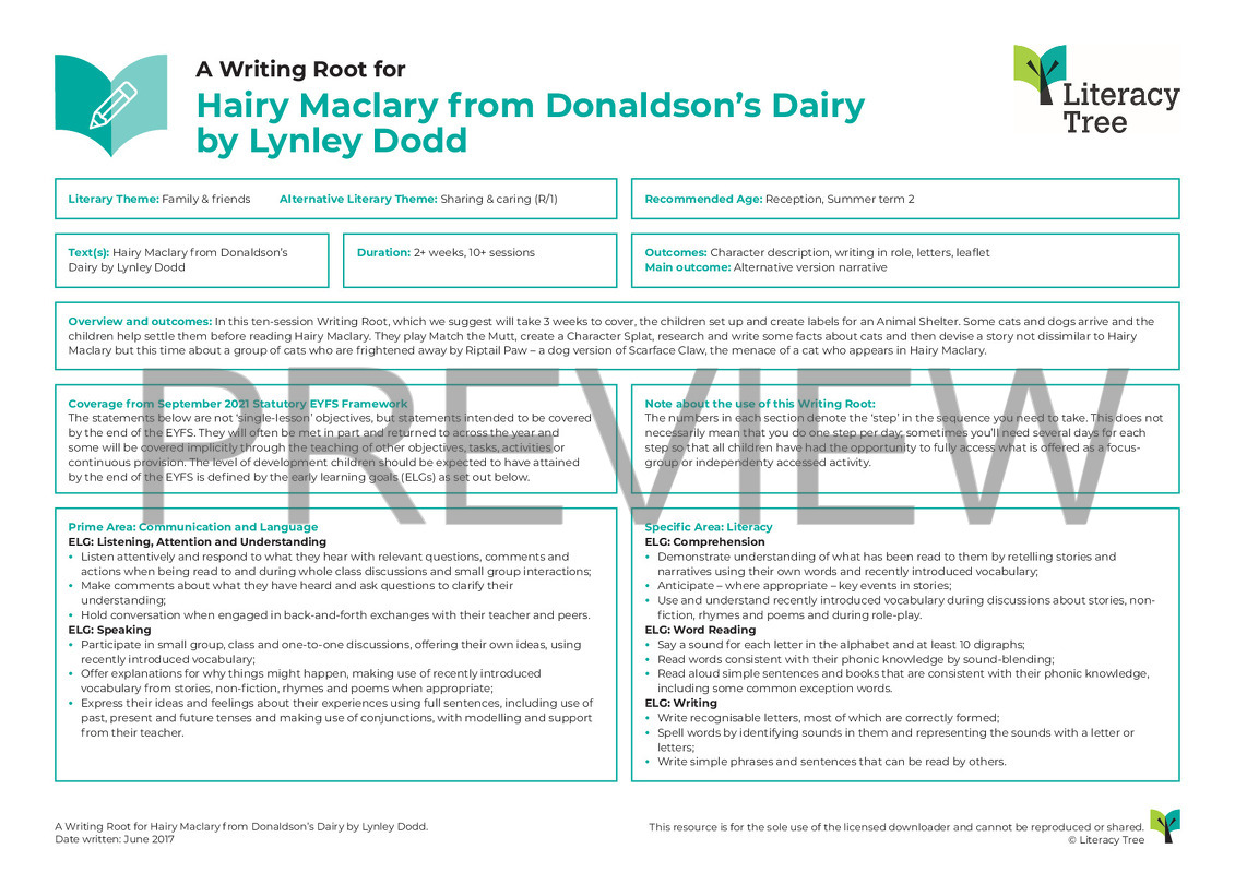 In this ten-session Writing Root, which we suggest will take 3 weeks to cover, the children set up and create labels for an Animal Shelter. Some cats and dogs arrive and the children help settle them before reading Hairy Maclary. They play Match the Mutt, create a Character Splat, research and write some facts about cats and then devise a story not dissimilar to Hairy Maclary but this time about a group of cats who are frightened away by Riptail Paw - a dog version of Scarface Claw, the menace of a cat who appears in Hairy Maclary.