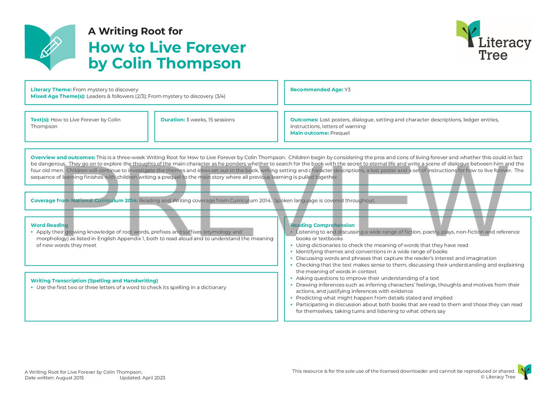 This is a three-week Writing Root for How to Live Forever by Colin Thompson. Children begin by considering the pros and cons of living forever and whether this could in fact be dangerous. They go on to explore the thoughts of the main character as he ponders whether to search for the book with the secret to eternal life and write a scene of dialogue between him and the four old men. Children will continue to investigate the themes and ideas set out in the book, writing setting and character descriptions, a lost poster and a set of instructions for how to live forever. The sequence of learning finishes with children writing a prequel to the main story where all previous learning is pulled together.