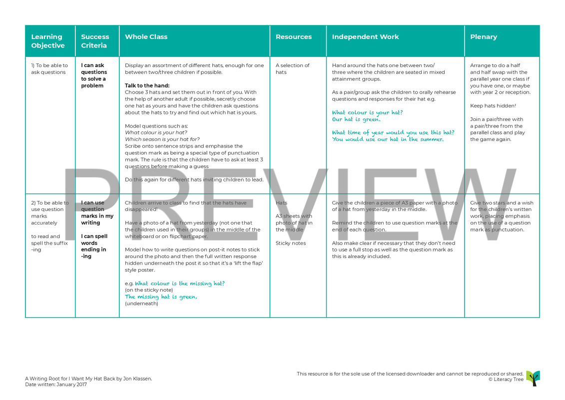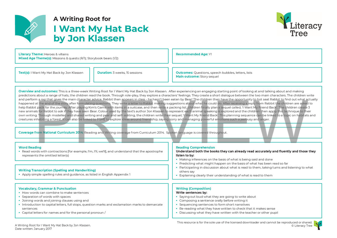 This is a three-week Writing Root for I Want My Hat Back by Jon Klassen. After experiencing an engaging starting point of looking at and talking and making predictions about a range of hats, the children read the book. Through role-play, they explore a characters’ feelings. They create a short dialogue between the two main characters and then write and perform a rap that gives the main character advice. Rabbit then appears in class - he hasn’t been eaten by Bear! The children then have the opportunity to hot seat Rabbit to find out what actually happened at the end of the story after formulating questions. They write a letter to Rabbit making suggestions about what he could do. After receiving a reply from Rabbit the children are asked to help Rabbit pack for the journey by playing Kim’s Game with items in a suitcase, and then write a packing list. Finally, children plan a sequel called, ‘I Want My Friend Back’. The children create three new animals for Rabbit to ask if they have seen Bear. Colour used by the text’s author Jon Klassen to represent each animal speaking is explored and the children then apply this technique to their own writing. Through modelled and shared writing and peer and self-editing, the children write their sequel, ‘I Want My Friend Back’. This Writing Root can be linked to a topic on habitats and creatures inhabiting a forest. It can also be linked to PSHE to explore ideas around friendship, saying sorry and managing powerful emotions such a jealousy and anger.