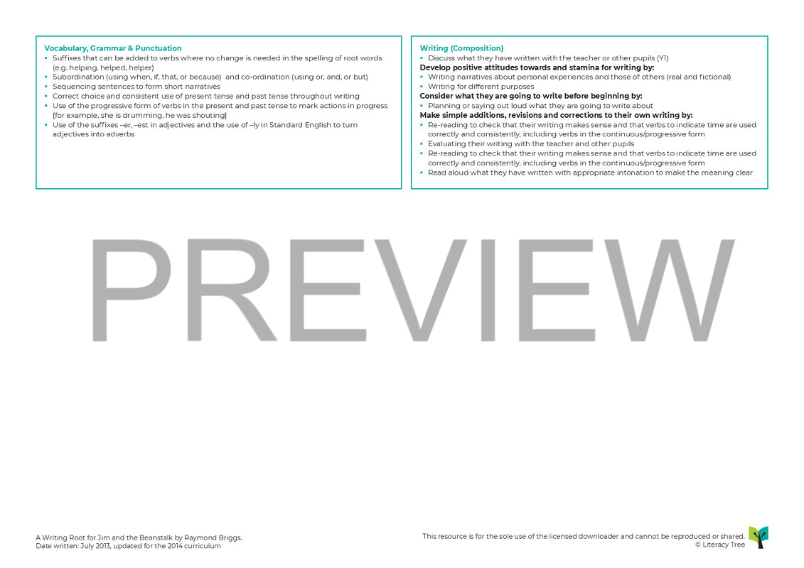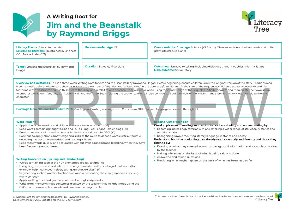 This is a three-week Writing Root for Jim and the Beanstalk by Raymond Briggs. To begin with, ensure children know the ‘original’ version of the story – read it some weeks before. Ensure they have access to a number of fairy tales and ‘twisted tales’ in the book area/class library. Introduce the idea of a fairy tale sequel, using ‘Jim and the Beanstalk’ by Raymond Briggs. Children discover a beanstalk and footprint in the classroom and use this to engage with and learn the story and retell it to one another. Children then use their knowledge of the sequel to initially innovate and then create their own sequel to another well-known fairytale, e.g. Auburn Hair and the Three Bears.