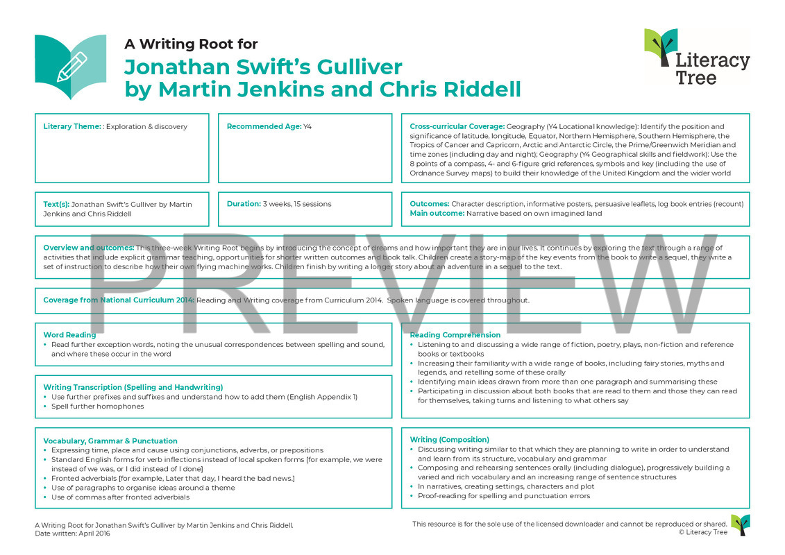 This is a three-week Writing Root for Jonathan Swift’s Gulliver by Martin Jenkins and Chris Riddell. Children will have read Gulliver’s Travels and been immersed in the various settings that he explores. This will be used as a basis for a variety of persuasive short writing opportunities, such as a poster and a leaflet before children move on to creating a logbook. The final longer written outcome will be the children creating their own imaginary lands to use as settings for a new adventure story where they are the explorer.