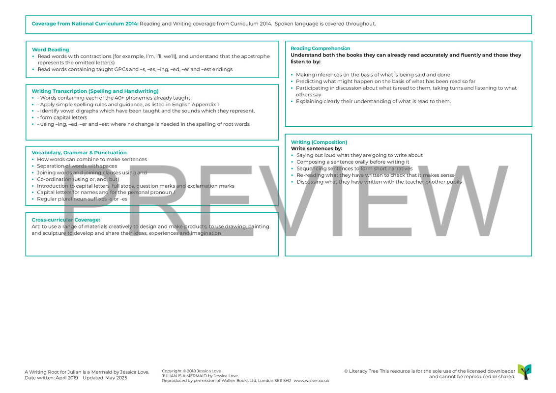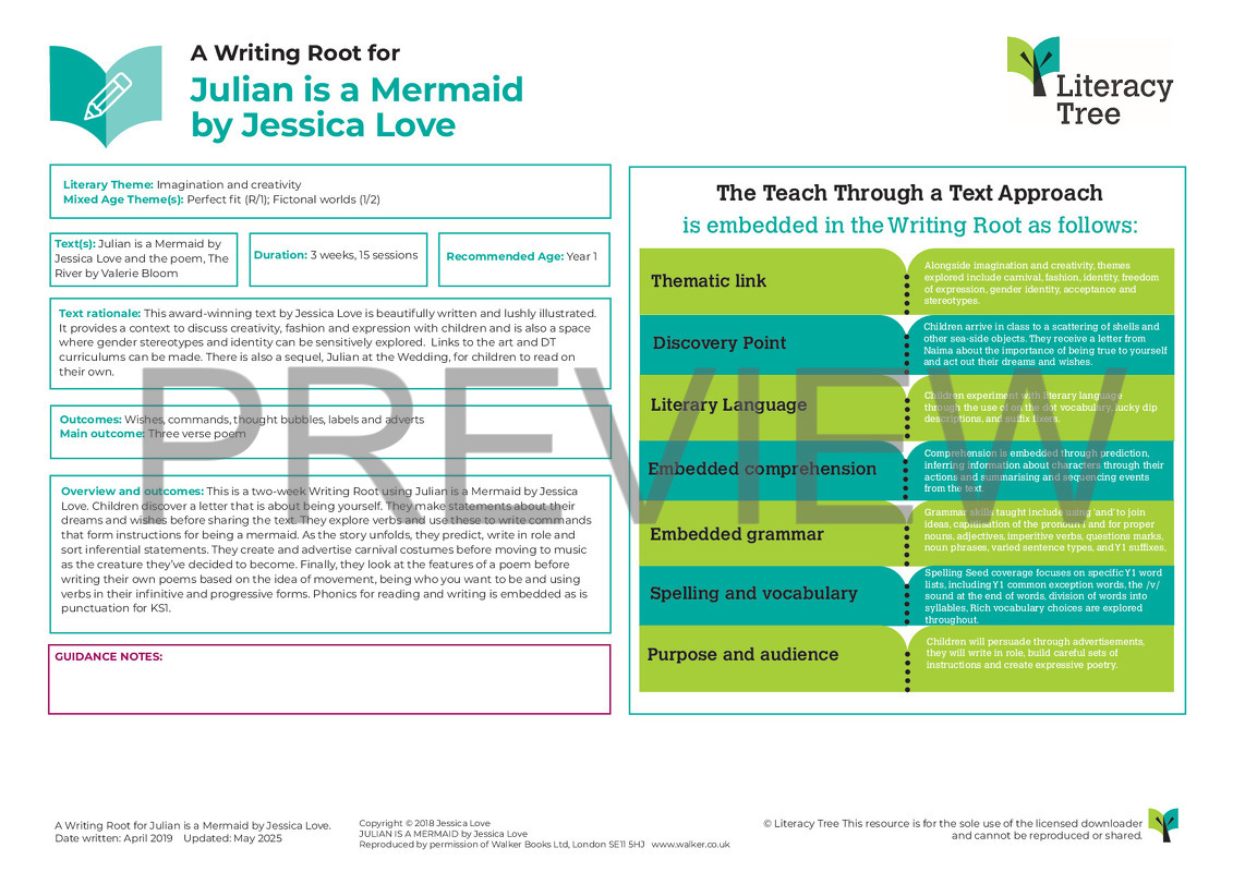 For the 2-week Writing Root for Julian is a Mermaid please contact resources@literacytree.com