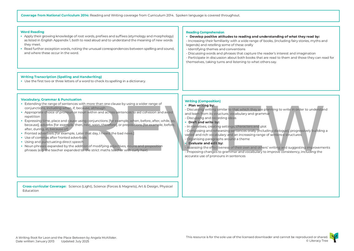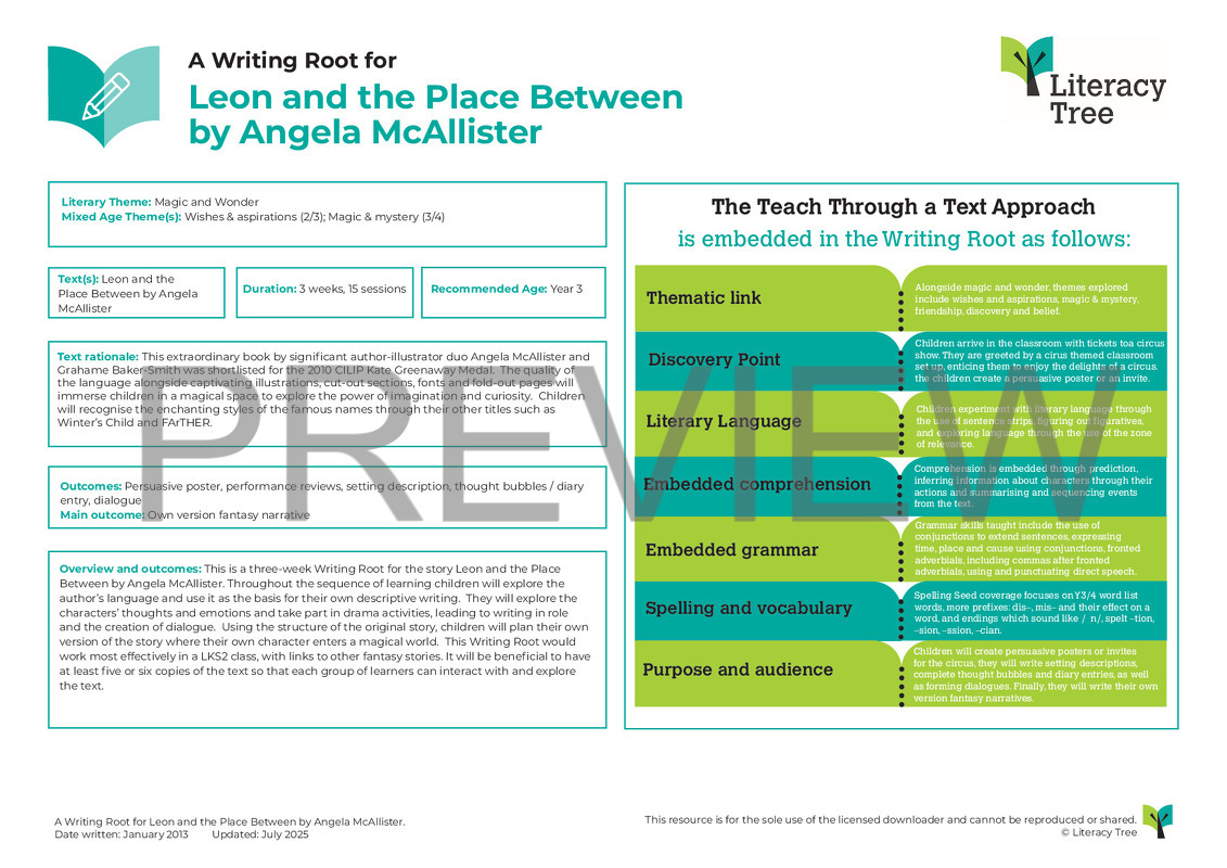 This is a three-week Writing Root for the story Leon and the Place Between by Angela McAllister. Throughout the sequence of learning children will explore the author’s language and use it as the basis for their own descriptive writing. They will explore the characters’ thoughts and emotions and take part in drama activities, leading to writing in role and the creation of dialogue. Using the structure of the original story, children will plan their own version of the story where their own character enters a magical world. This Writing Root would work most effectively in a LKS2 class, with links to other fantasy stories. It will be beneficial to have at least five or six copies of the text so that each group of learners can interact with and explore the text.