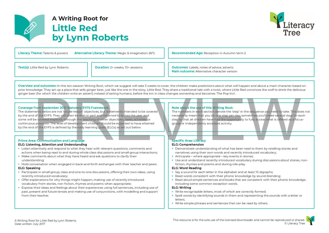 In this ten-session Writing Root, which we suggest will take 3 weeks to cover, the children make predictions about what will happen and about a main character based on prior knowledge. They set up ‘The Belch Inn’ in class – a place that sells ginger beer, just like the one in the story, Little Red. They share a traditional tale with a twist, where Little Red convinces the wolf to drink the delicious ginger beer (for which the children write an advert) instead of eating humans, before the inn in class changes ownership and becomes ‘The Pop Inn’. But then a bear arrives and ransacks the inn…can the children’s Banana Berry Burst save the day? The sequence of learning culminates in the invention of a new character - Little Blue - and the writing of an innovated version of the original.
