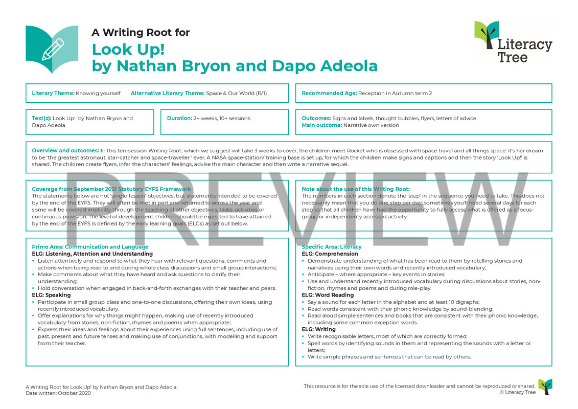 In this ten-session Writing Root, which we suggest will take 3 weeks to cover, the children meet Rocket who is obsessed with space travel and all things space: it’s her dream to be ‘the greatest astronaut, star-catcher and space-traveller ‘ ever. A NASA space-station/ training base is set up, for which the children make signs and captions and then the story ‘Look Up!’ is shared. The children create flyers, infer the characters’ feelings, advise the main character and then write a narrative sequel. Early Reading teaching is embedded throughout and suggestions for Continuous Provision are also made.