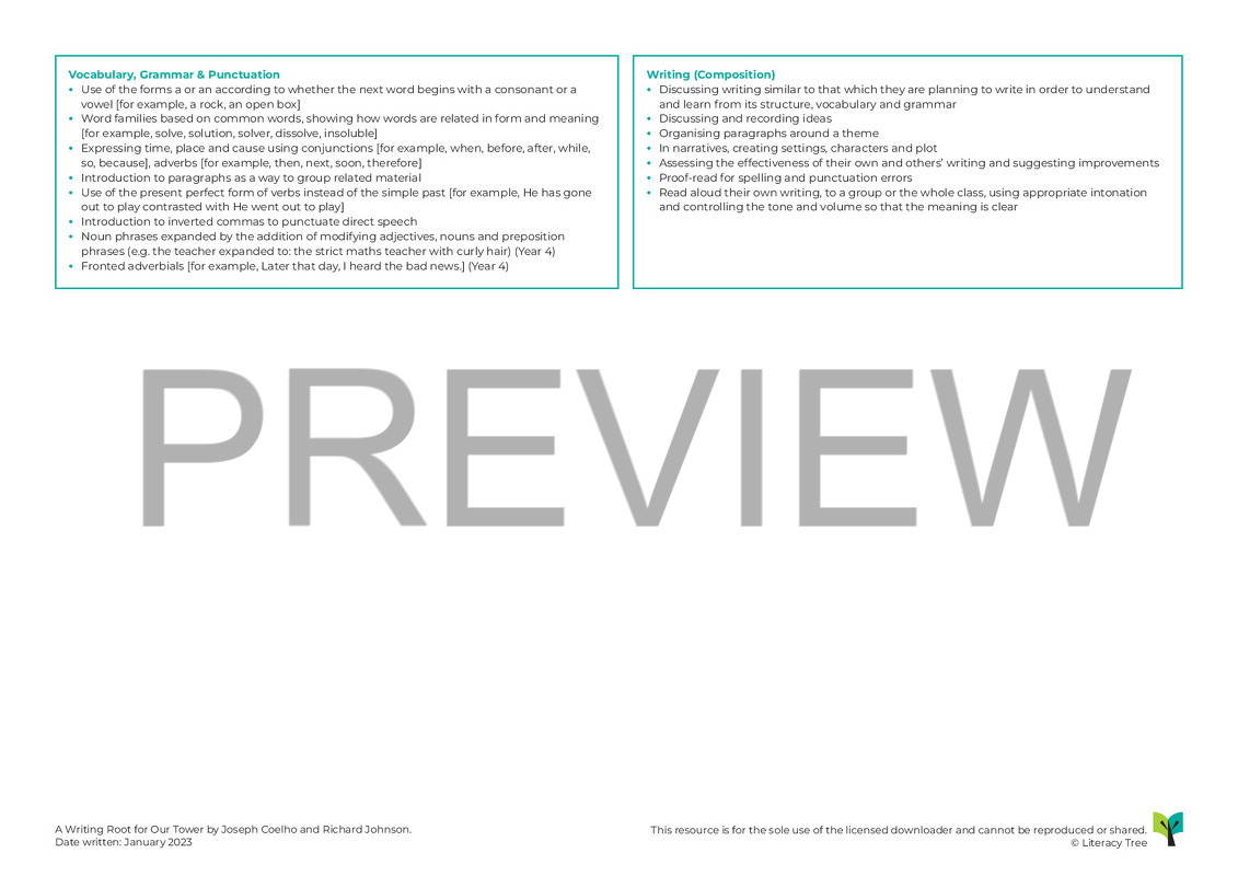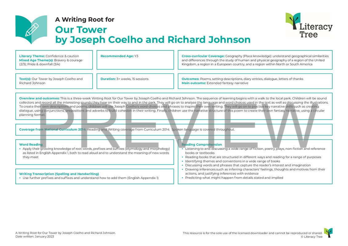 This is a three-week Writing Root for Our Tower by Joseph Coelho and Richard Johnson. The sequence of learning begins with a walk to the local park. Children will be sound collectors and record all the interesting sounds they hear on their way to and in the park. They will go on to analyse the language and word choices used in the text as well as discussing the illustrations. To create their own descriptions and poems, children will use Joseph Coelho’s word choices and phrases to inspire their own writing. They will go on to practise key narrative skills such as creating dialogue, using conjunctions, prepositions and adverbs to build cohesion in their writing. Finally, children use the narrative structure of this poem to create their own fantasy narrative, using a circular planning format.